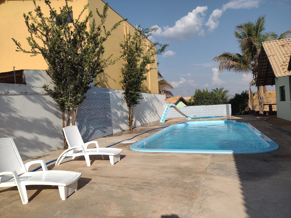 Estamos dentro de uma Reserva Ecológica próxima a cidade Chapada dos Guimarães Vale do Jamaca.. ...nossa Hospedagem está na área externa em meio ao bosque ,com redes, piscina exclusiva,rodeado por *mata ciliar* , não temos Suítes a mais que compartilham o local , Suite privada com amplo espaço, banheiro, cama para casal Queen ,cama para solteiro , Ar-condicionado, frigobar, mesa de trabalho. armário , bebedouro, taças, chaleira elétrica, xícaras.