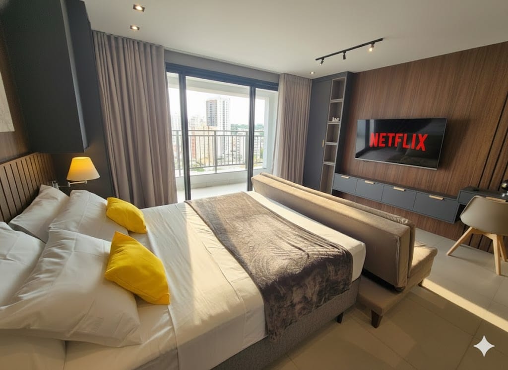 Muito conforto nesse elegante estúdio no Prime Flats Tower. Há uma quadra do Shopping Campo Grande, temos tudo o que você precisa: wi-fi, cozinha completa, home office, mesa de jantar, TV Smart 55'', cama queen de luxo em um quarto privativo. Condomínio conta com piscina na cobertura, academia e espaço de coworking. Estúdio de alto luxo, elegantemente decorado. Dispomos de camas extras, serviço de transfer e minibar.