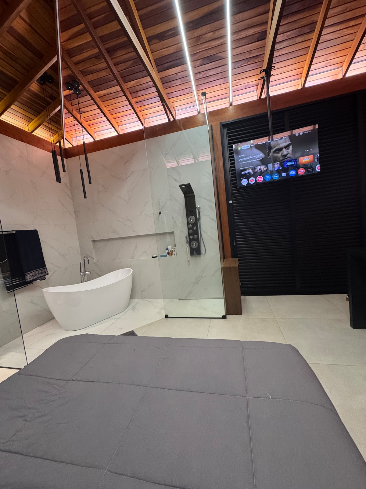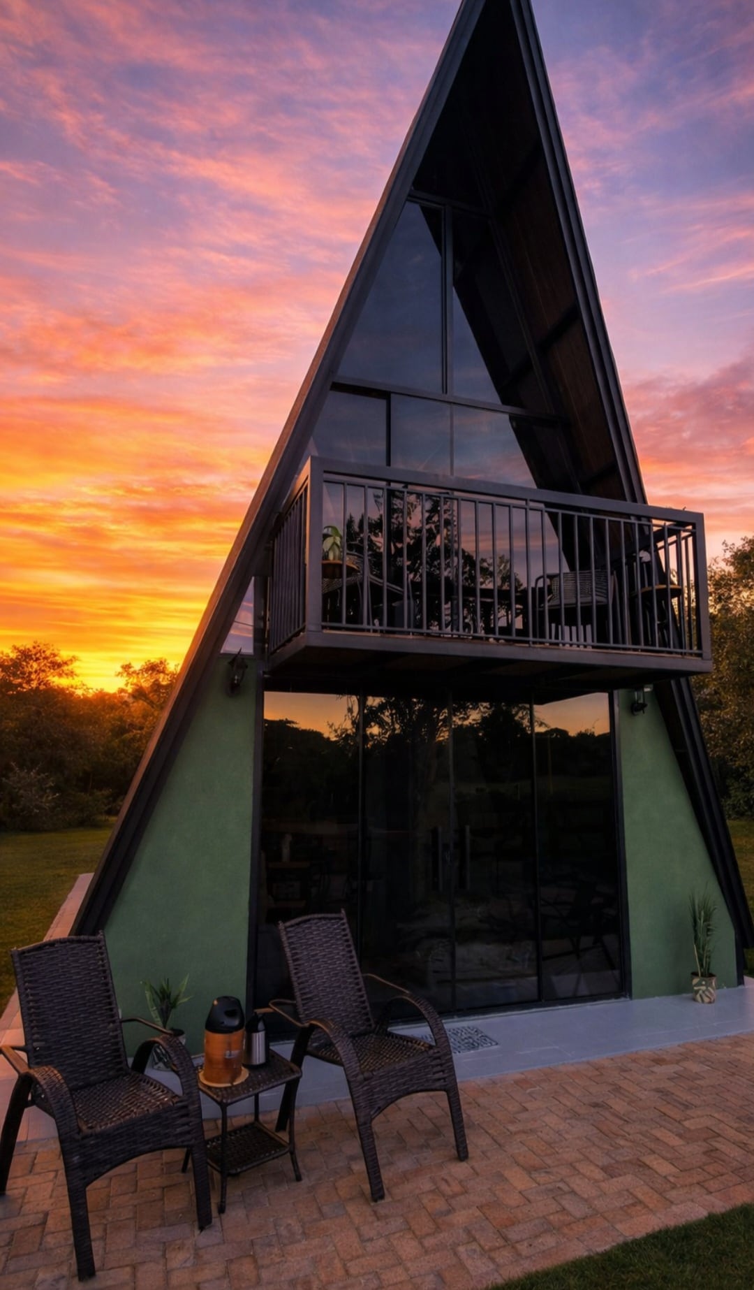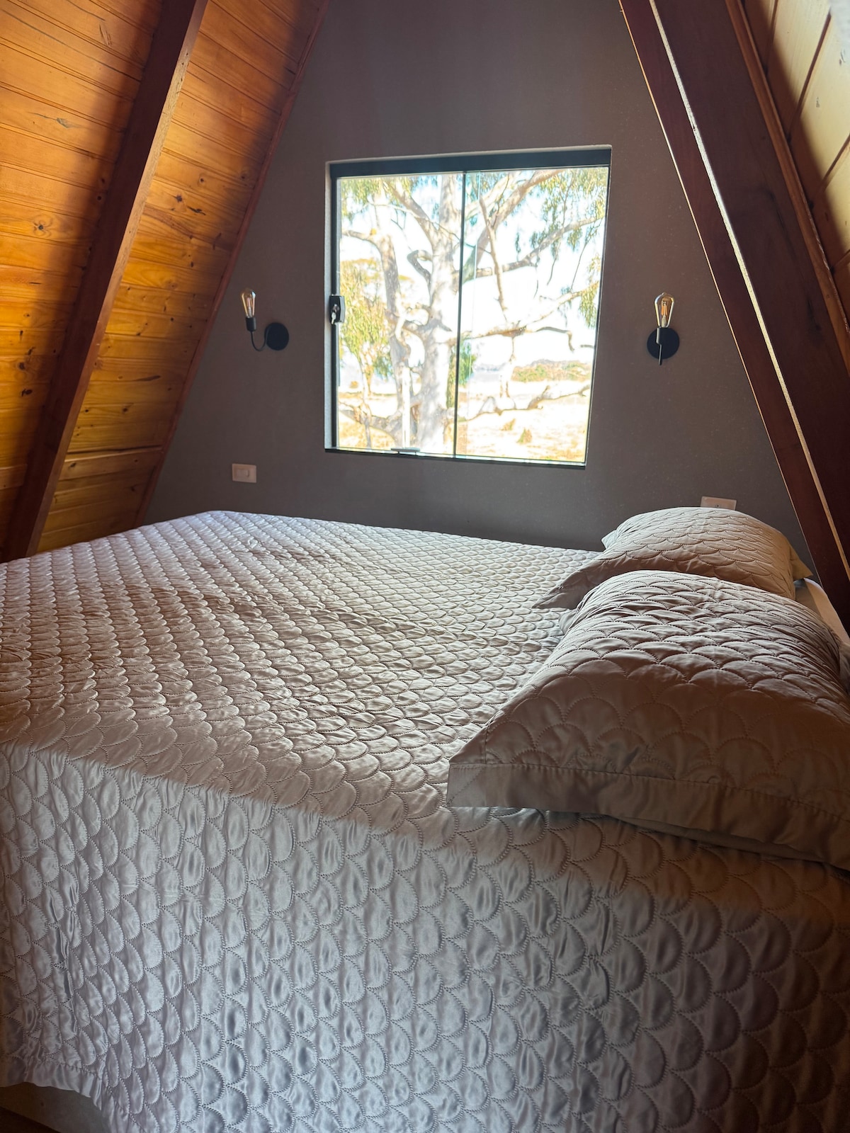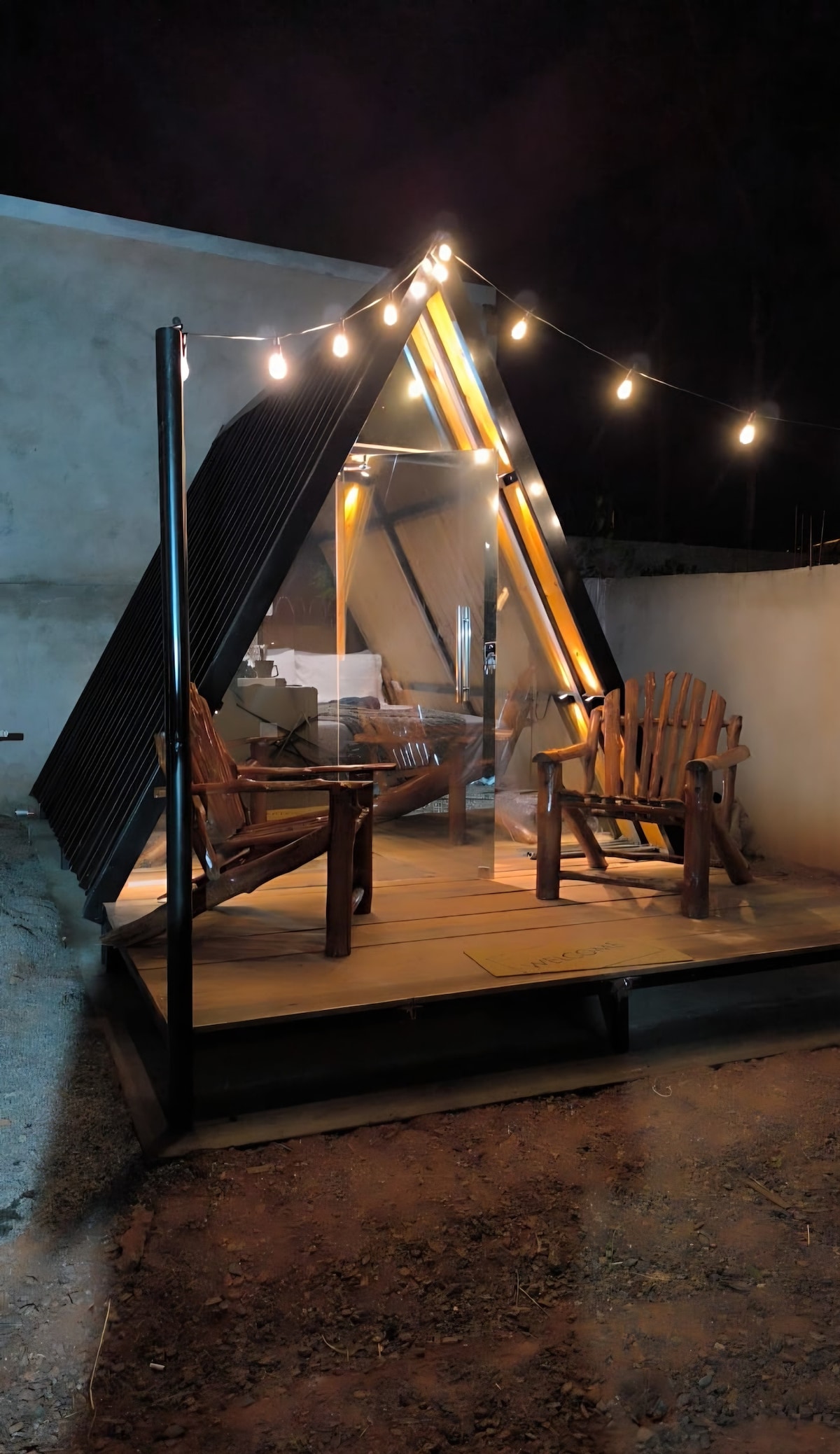 Seja bem-vindo ao nosso charmoso chalé de estilo A-frame, onde o conforto encontra a natureza. Localizado em um cenário deslumbrante cercado por palmeiras, o nosso chalé oferece a escapada perfeita para quem busca tranquilidade e contato com a natureza. Desfrute de um interior bem decorado, sala de estar confortável, cozinha totalmente equipada, e um mezanino perfeito para relaxar. Relaxe no nosso jardim, aproveite o fogo de chão sob as estrelas, ou tome um banho relaxante em nosso spa.