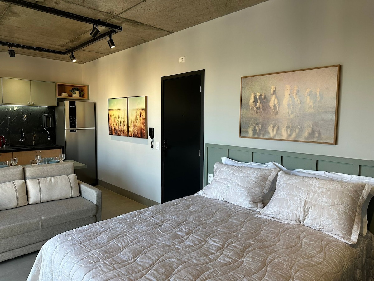 FLAT TIPO LOFT Espaço completo com 43 m2, o dobro dos hoteis, com garagem grátis. Flat 5 estrelas dentro de um hotel 4 estrelas, com uso grátis de piscina, sauna, academia, salão de jogos, recepção 24 horas, sala de espera e serviços pagos como café da manha , restaurante e room service, tudo com segurança. À 400 m do centro, perto de supermercados, farmácias, teatro, restaurantes. Consulte nos aplicativos as disponibilidades dos flats 702, 901,902, 1002 e 1003. Temático Londres. Tudo novo.