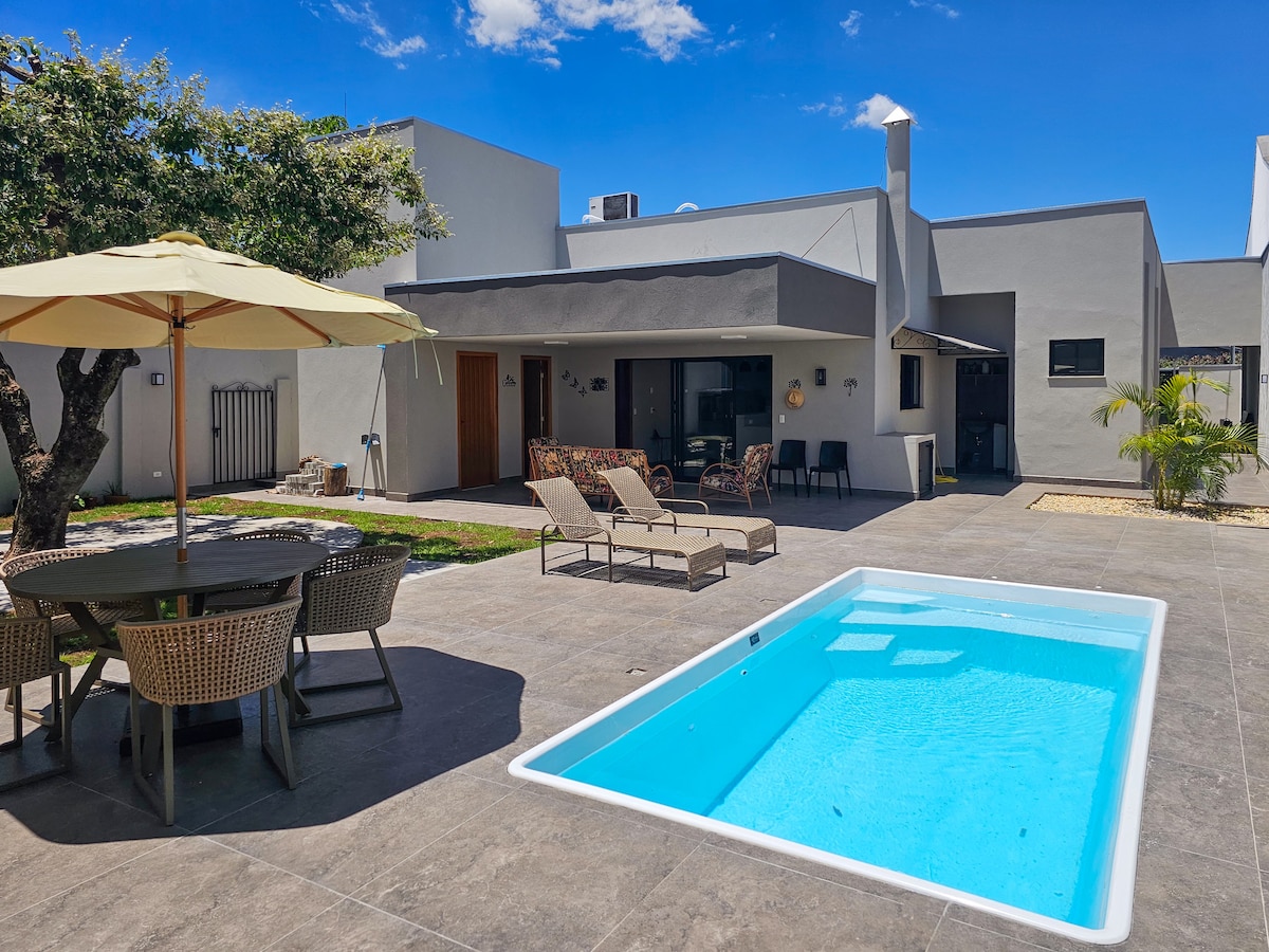 Casa projetada especialmente, para atender turistas, construída a menos de 1 ano, ideal para pessoas que procuram um contato com a natureza, mas quer contar com as comodidades da cidade. Lugar tranquilo, aconchegante, harmonioso. Quartos: Camas box, com lençóis, wi fi, churrasqueira, chuveirão no jardim, patio grande para carros e brincadeiras das crianças. Cozinha: geladeira, microondas, fogão coocktop, utensílios domésticos novos. Estamos prontos para atender você e sua familia!!!!