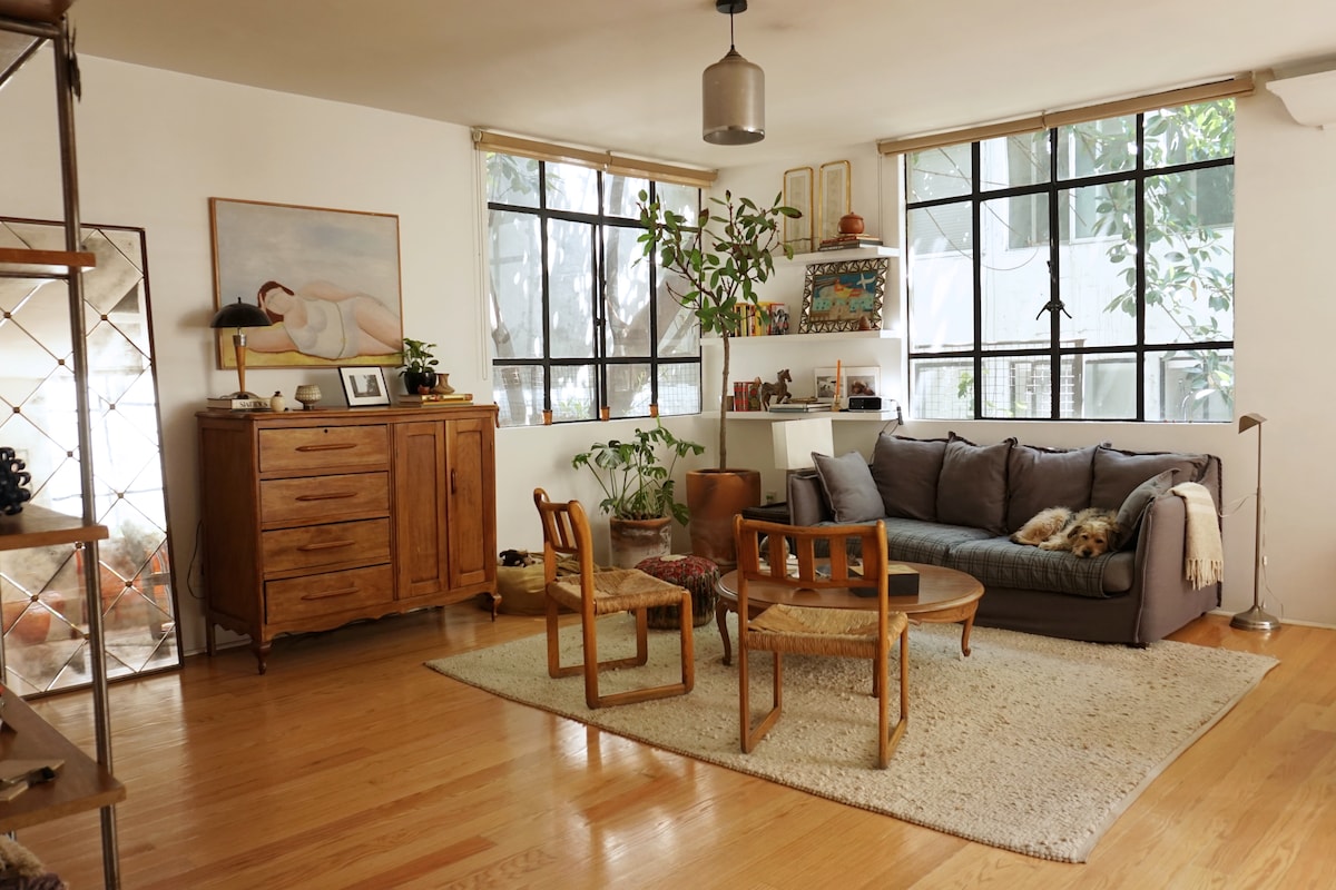 "Mexican traditions", located in a Porfirian building in Roma Norte, decorated with references to Mexican traditions. It has: spacious and equipped bathroom; washing machine strategically located; kitchen equipped with grill, microwave, and refrigerator; dining room with table and chairs for four people; living room with sofa and chairs to relax. Master bedroom with king-size bed, closet, TV and air conditioning. Access to the garden from the living room and bedroom. Ideal for extended stays.