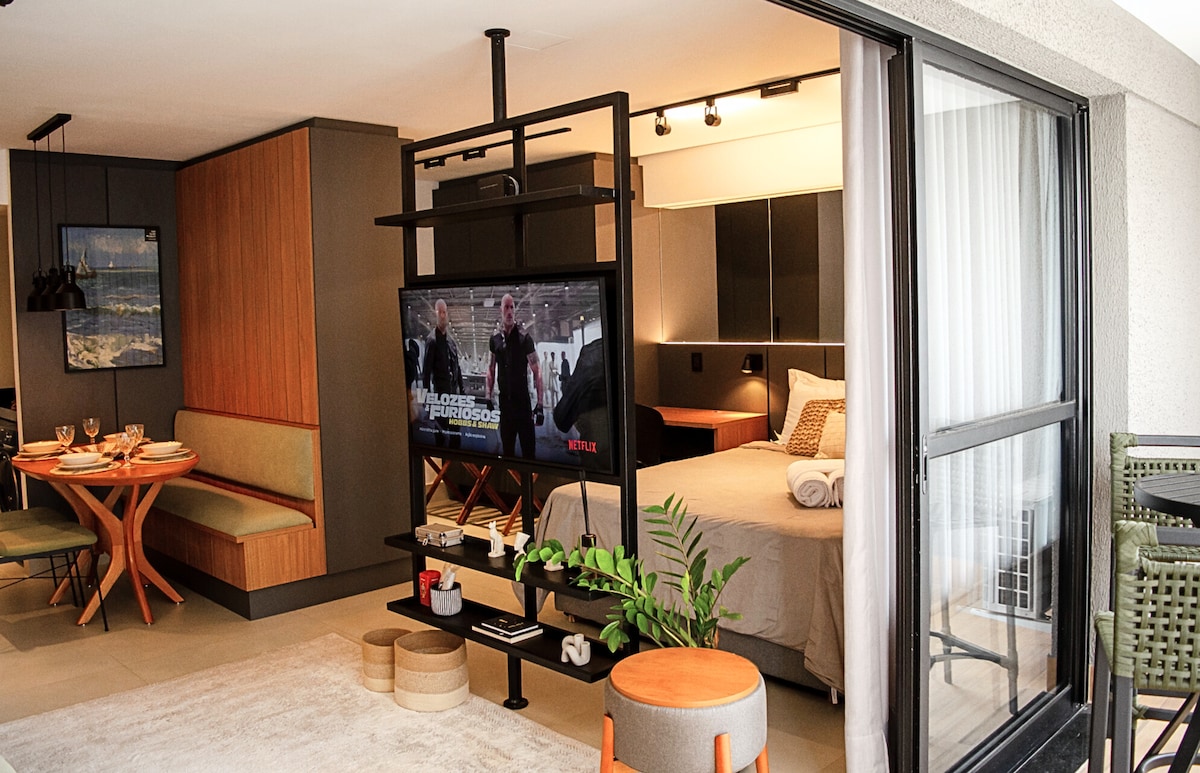 O Flat tem arquitetura assinada por um dos profissionais mais renomados de Goiânia. A idéia é você poder se sentir em casa durante a sua hospedagem. Tudo automatizado; luzes, cortina, TV, Ar Condicionado que oferecem comodidade e requinte, basta pedir para Alexa. Escute músicas, assista a mais de 1.600 canais abertos e fechados. Tome um banho gostoso com uma ducha generosa. Faça fotos e descanse na varanda com uma vista do por do sol sensacional e teto de acrílico.