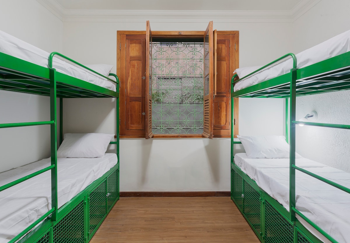 Quarto compartilhado misto com 9 camas. Tem armário e ar condicionado (Com horário limitado). Os banheiros são compartilhados e podem ser dentro ou do lado de fora do quarto. Está incluída a roupa de cama e internet wi-fi. Também está disponível uma cozinha compartilhada para uso dos hóspedes.