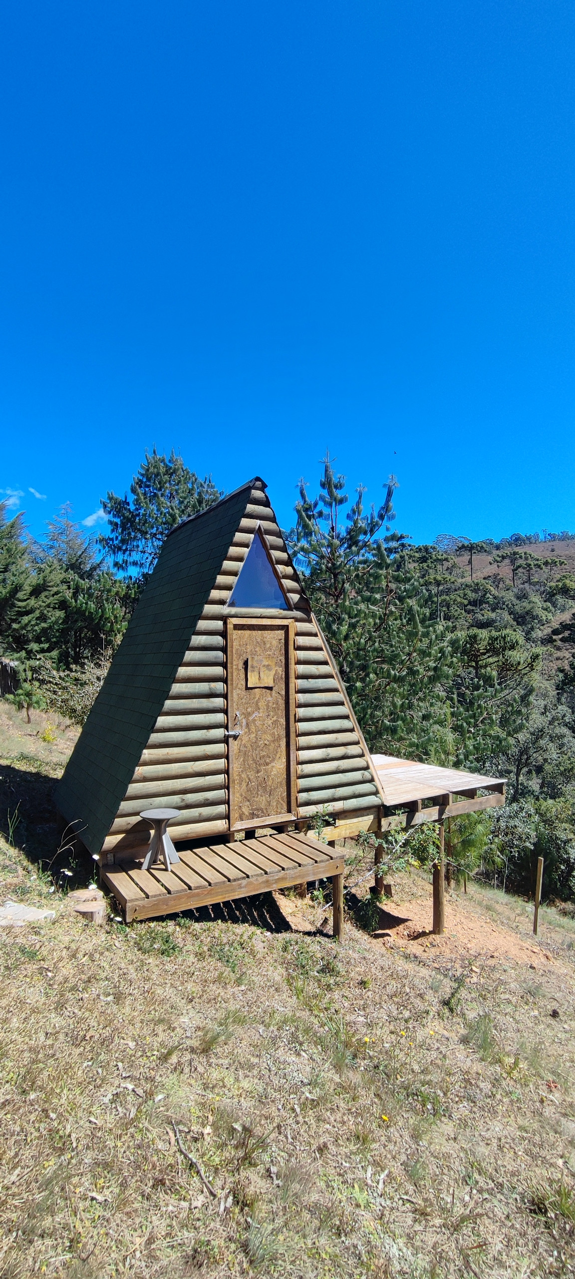 MINICABANA A-frame com parede basculante e deck, vista incrível! Na cabana: cama de casal, enxoval, toalhas, cobertas, aquecedor, mesa e cadeiras, cortina blackout, luz, tomadas e WiFi. ESTRUTURA A ALGUNS PASSOS: 2 banheiros completos, lavabo, cozinha equipada e ofurô. Estas instalações são COMPARTILHADAS entre os hóspedes das 5 cabanas. Ofurô disponível sob agendamento e taxa de serviço. O Glamping Amanita está em área de proteção ambiental de 20.000m COM CACHOEIRA E BOSQUE PRIVATIVOS