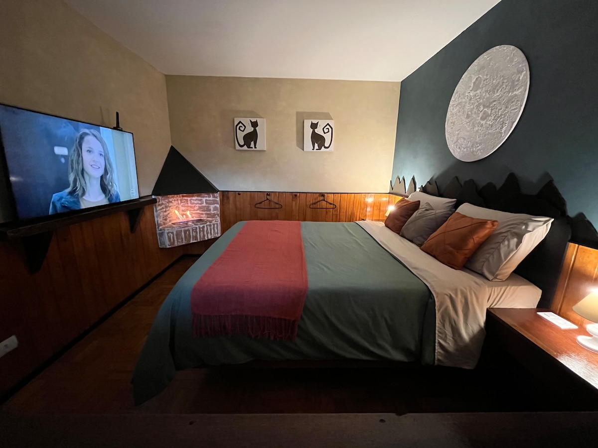 Suíte de Hóspedes completamente independente. Com ar condicionado e aquecimento. Situada em rua de acesso a Condomínio fechado, sem saída, monitorada por câmeras,, tranquila e segura. Suíte super aconchegante e indevassável. As instalações incluem quarto, banheiro e cozinha equipada com fogão. Prepare café da manhã e pequenas refeições. Para os que apreciam um bom vinho, há taças, tábuas e facas para queijos, e panela de Fondue pra saborear ao redor da lareira instalada no quarto.