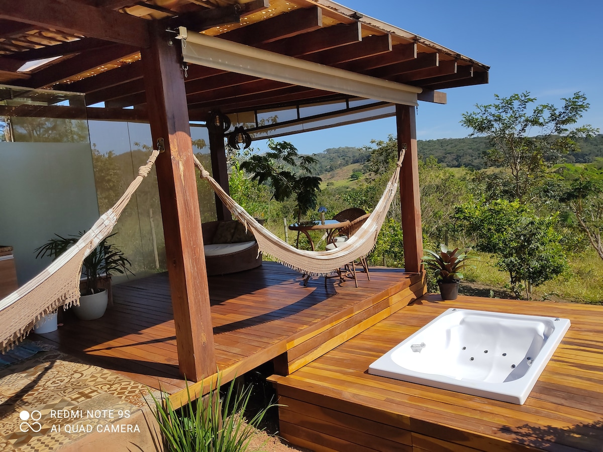 Bangalô com a melhor vista da Serra da Moeda, simples e aconchegante, única acomodação no terreno, com ducha aquecida à gás, forro em madeira, geladeira, deck com pergolado coberto. O deck conta com chaise, redes e mesinha para tomar um vinho vendo o pôr do sol ou o nascer da lua cheia. Cozinha completa com fogão e utensílios, churrasqueira portátil. A Serra da Moeda se ergue à frente do chalé. Sinta-se abraçado pela natureza que cerca o local e convida a relaxar e aproveitar o momento!