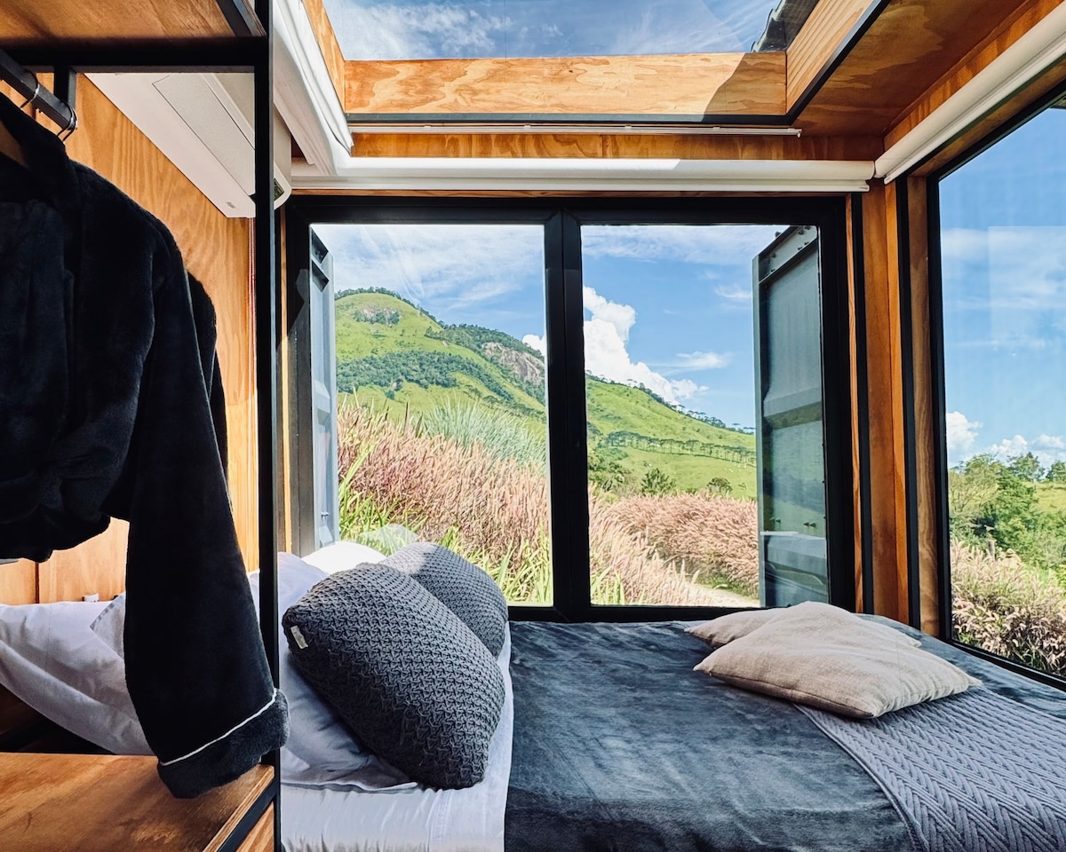 Descubra o encanto da Serra da Mantiqueira nesta cabana projetada para que você possa contemplar o nascer do sol sem sair da cama. Venha relaxar em nosso spa aquecido, observar as estrelas na rede suspensa e balanço. A cabana possui um quarto integrado com uma aconchegante cama Queen. Na sala/cozinha, um futon super confortável acomoda mais dois hóspedes, tornando a experiência ideal para famílias. A propriedade também conta com trilhas e pequenas quedas d'água.