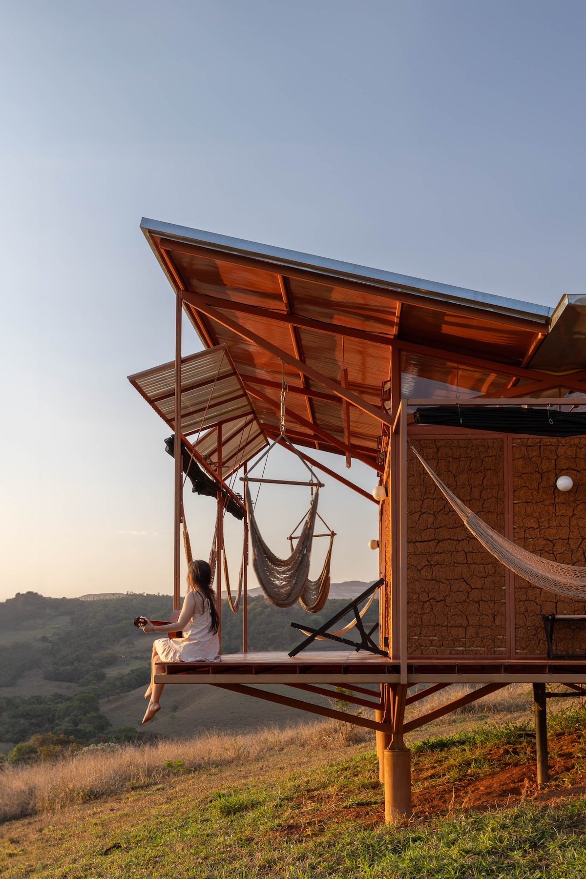 A Casa Igarapé é uma cabana ecológica no pé da Serra de Igarapé, feita com terra crua, aço, madeira e cerâmica. O refúgio se integra ao ambiente: da varanda ou do spa você tem vista aberta para as colinas, com intenso pôr do sol e céu estrelado sem as luzes da cidade. Tudo é silêncio, quebrado só por tucanos e siriemas. Boa para trabalho remoto com concentração. Entre Itaúna e Inhotim, é ideal para casais românticos de Belo Horizonte e região ou de outras cidades, à procura de paz e aconchego.
