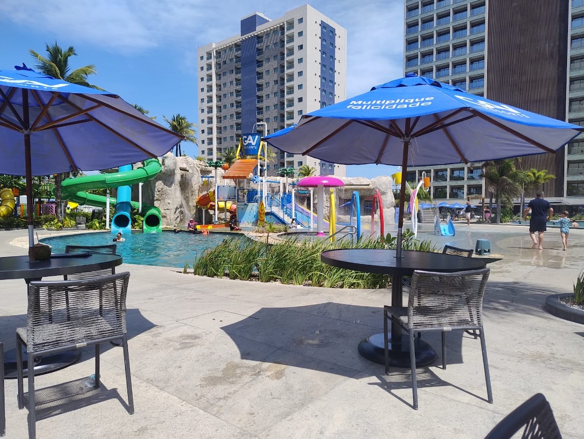 Apartamento com 1 quarto e sofá cama no salinas premium resort com acesso a todas as áreas comuns. Há uma pequena cozinha no apartamento com microondas, frigobar, pratos e talheres. Tratamento de hotel sem o café da manhã que pode ser pago a parte no cartão de consumo que recebem na realização do check in.