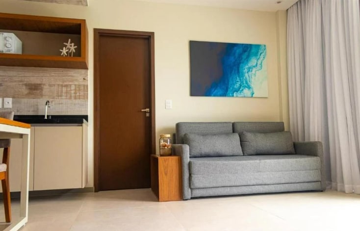 Apartamento de 37m² com ambiente de cozinha americana e sala integrados, sala com sofá cama, Smart TV 40” e ar condicionado, cozinha com mesa e quatro cadeiras, micro-ondas, frigobar e utensílios básicos (pratos, copos e talheres), além de varanda com mesa e cadeiras. Quarto com cama de casal, Smart Tv 40” e ar condicionado. Apartamento possui um banheiro, amenities e enxoval completo. Wi-fi. Não inclui café da manhã no valor da diária, porém pode ser adquirido diretamente no Resort