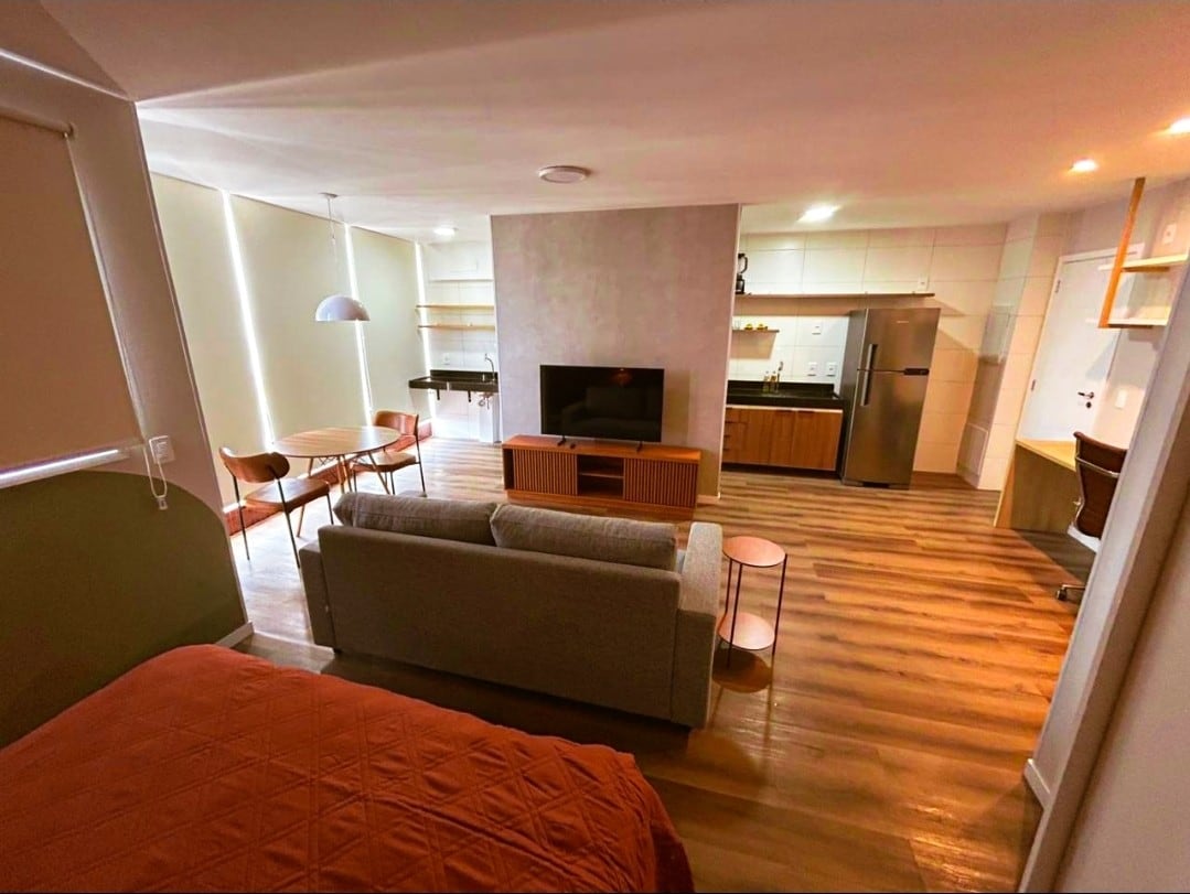Apartamento completo e bem equipado, possui cozinha com geladeira, cooktop, forno, microondas e máquina lava e seca. Com dois quartos, sendo uma suíte. Suíte com uma cama de casal e o outro quarto com uma bicama. Banheiro social. Localização estratégica, próximo de farmácias, restaurantes e supermercados. Condomínio com área de lazer completo com piscina e academia. Estacionamento privativo com uma vaga de garagem.
