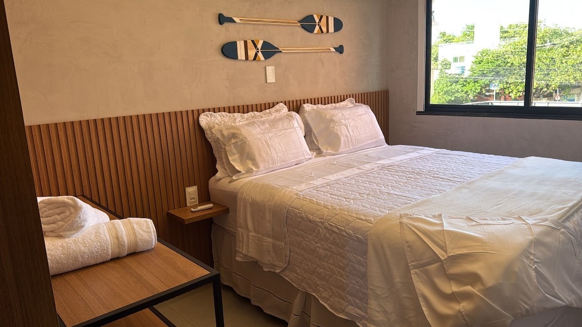 Viva uma experiência de hotel boutique neste flat com design exclusivo e alma praiana. O espaço une sofisticação e conforto, apresentando marcenaria fina, painel ripado e decoração curada com elementos náuticos. Desfrute de uma suíte climatizada, banheiro premium com pia esculpida e uma cozinha funcional equipada. Perfeito para casais que buscam um refúgio moderno, elegante e relaxante. Cada detalhe foi pensado para oferecer uma estadia inesquecível.