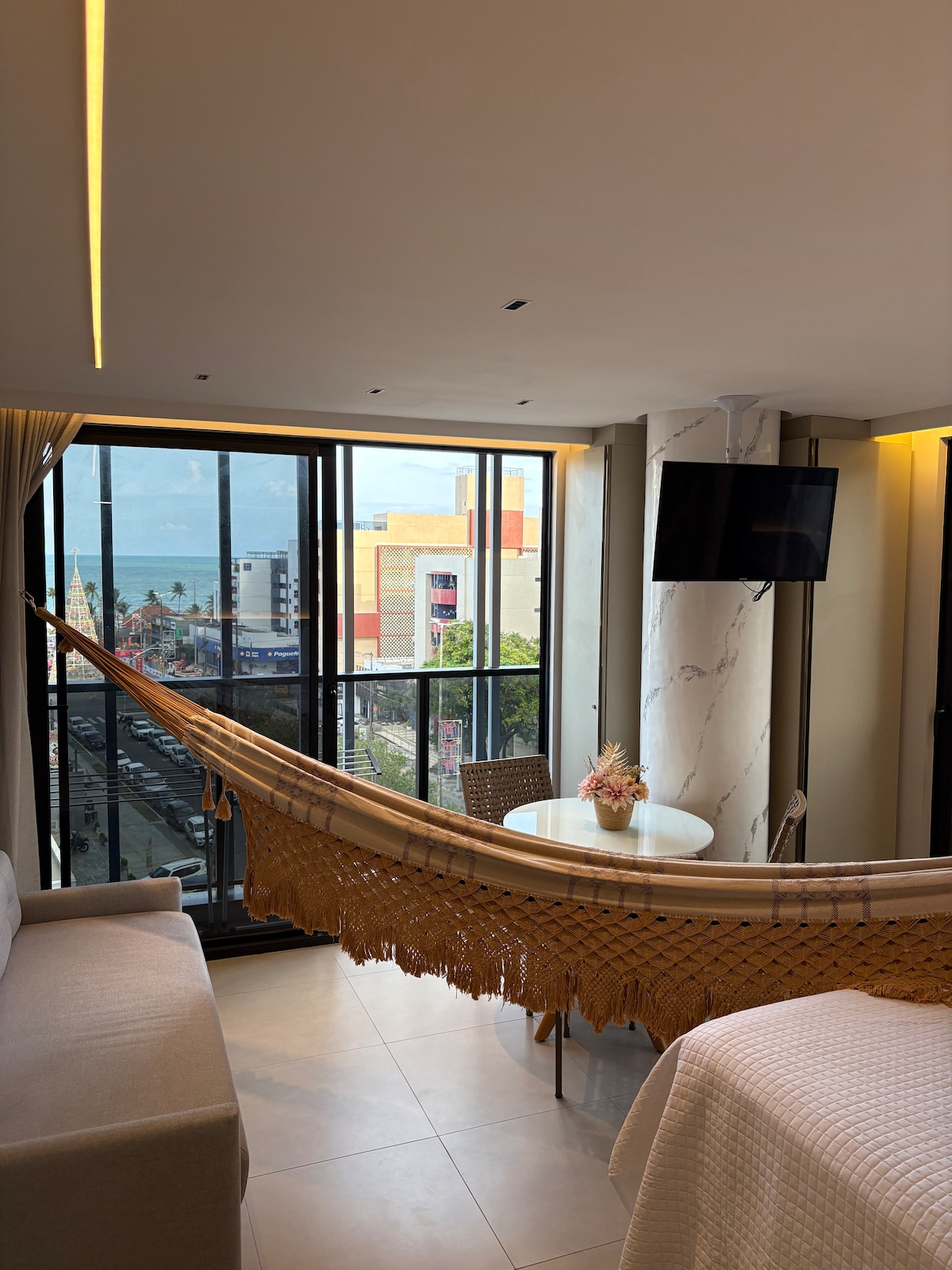 Flat com vista para o mar, localizado no bairro do cabo branco, 15 min do centro de convenções de João pessoa, 300m parada de ônibus. Acomodação possui, enxoval completo, varanda, internet individual gratis no quarto e internet por todo o empreendimento, piscina com borda infinita e restaurante no rooftop, smart tv led 49', ar condicionado, frigobar. Cozinha com cafeteira, micro-ondas, pratos, talhares, copos e taças, panelas e fogão. Máquina de gelo grátis, balde de gelo disponível no quarto.