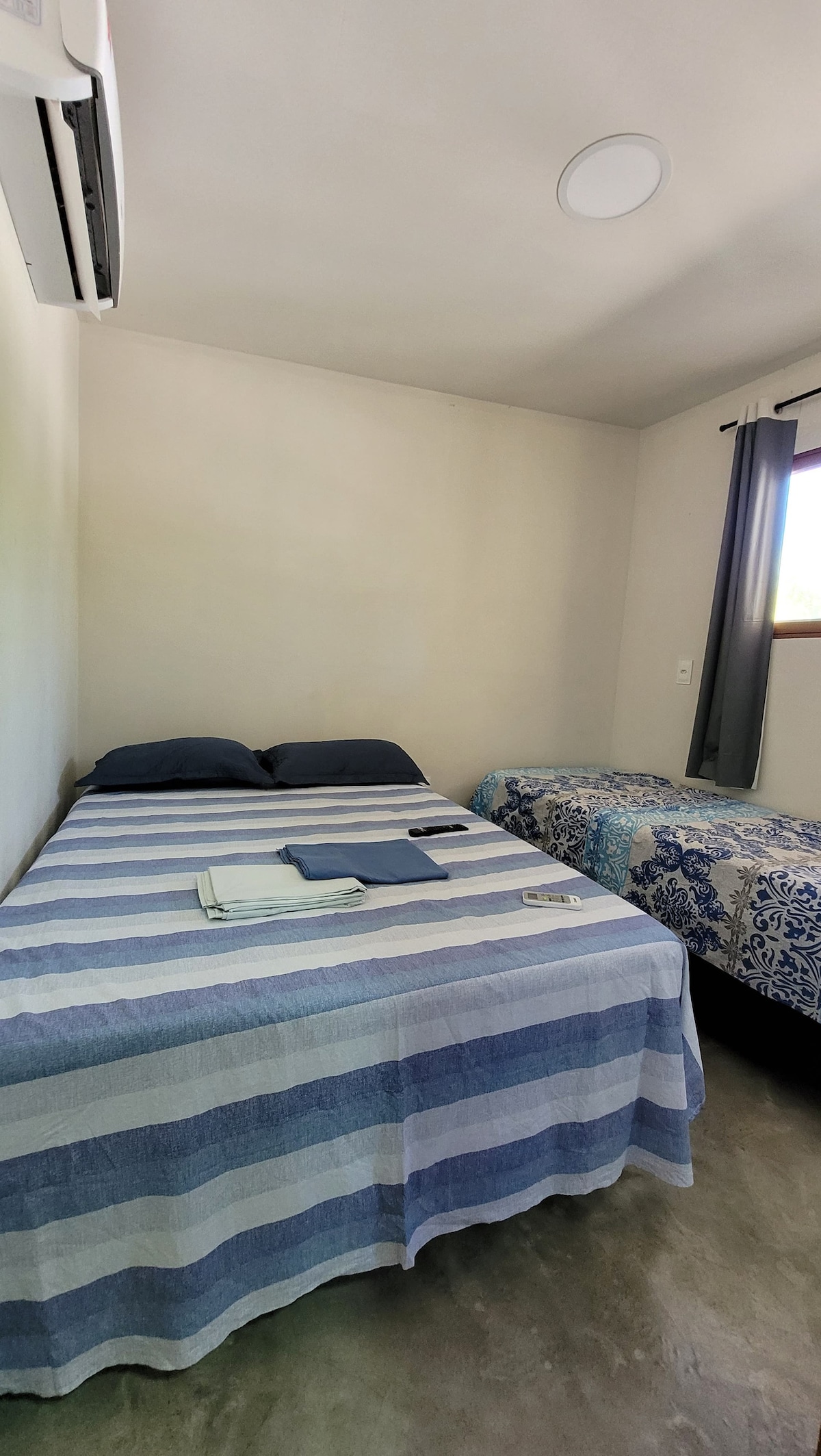 Chalé com quarto climatizado para três pessoas, incluindo uma cama de casal e uma de solteiro. O banheiro e a cozinha estão equipados com cooktop, geladeira e utensílios.