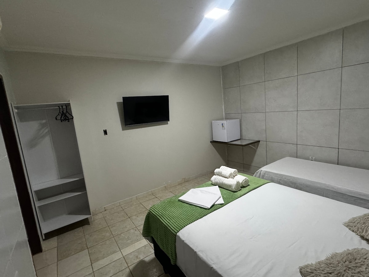 O quarto possui uma cama de solteiro, ventilador, tv simples e o chuveiro não é elétrico. Estamos com problema com o chuveiro elétrico do quarto.