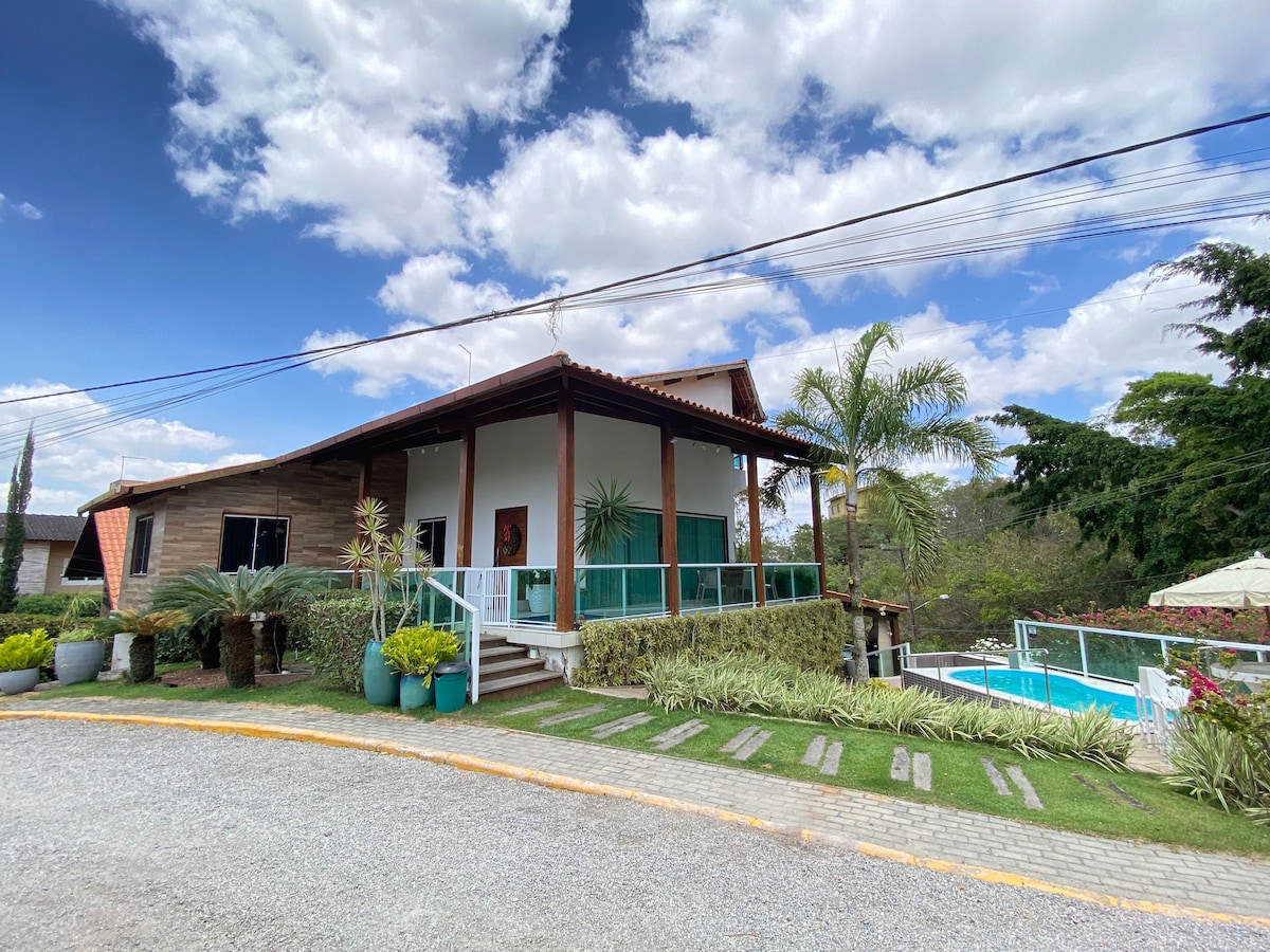 Casa de campo aconchegante com jardim de palmeiras e decoração rústica no condomínio Águas da Serra, um dos melhores da região, ideal para famílias e crianças. Em frente ao campo de golfe, a casa conta com 2 suítes e 2 quartos, todos com ar-condicionado. Uma das suítes tem smart TV. Roupas de cama e banho, Wi-Fi, cozinha completa e área gourmet com churrasqueira. Amplo jardim, parquinho e varanda com redes. A 5 min do centro, perto de mercados e restaurantes.