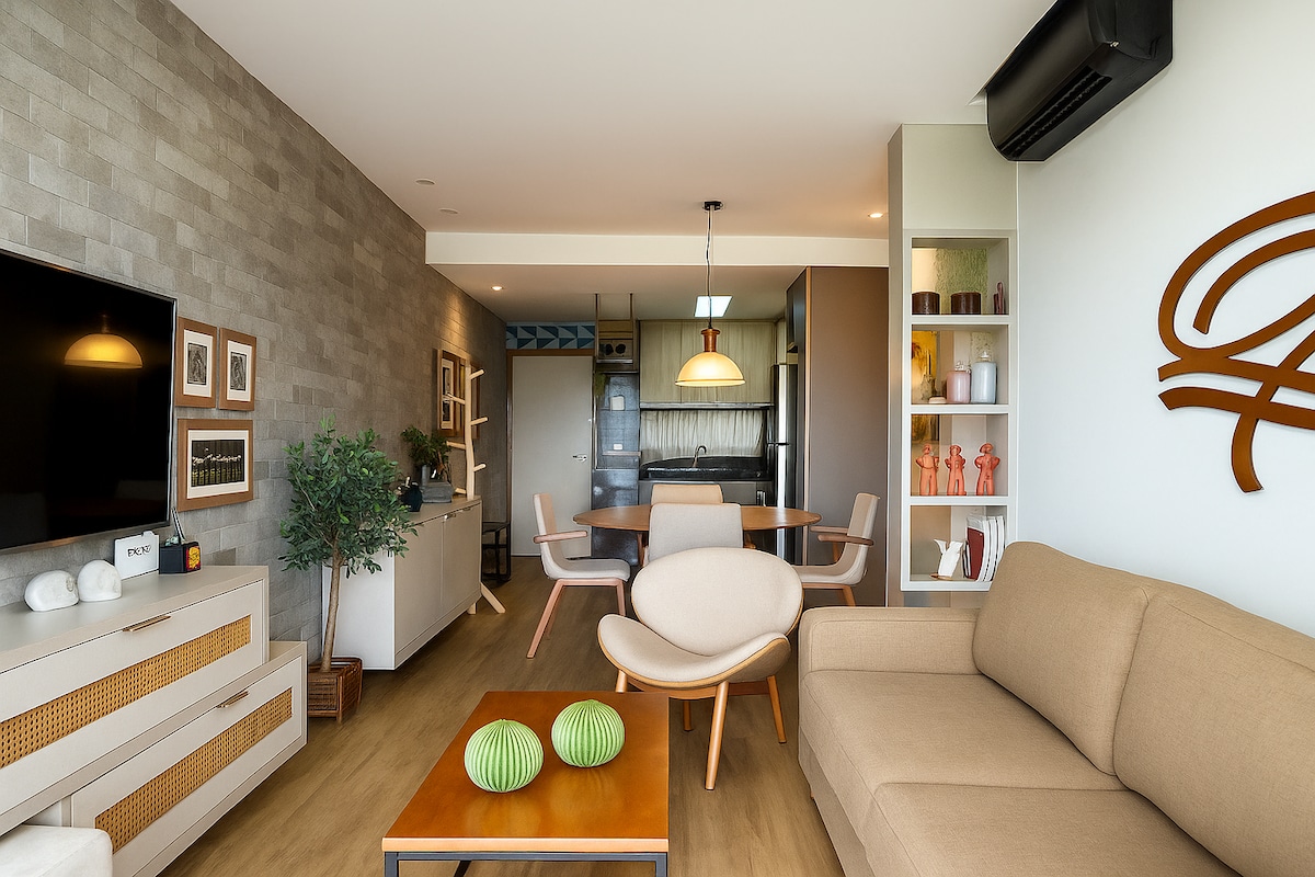 Flat/apartamento de alto padrão, bem decorado, aconchegante, limpo e arejado. * Cozinha: Micro-ondas, sanduicheira, liquidificador, cooktop a gás, geladeira, cafeteira (cápsulas Nespresso) e demais utensílios; * Sala/Quarto TV 50 polegadas, WIFI de alta velocidade, sofá-cama, mesa de jantar, cama de casal, guarda-roupa; * Banheiro: Box, chuveiro elétrico, espelho, ducha higiênica; Vagas de garagem subterrâneas rotativas Muito bem localizado a 350m da praia de Tambaú. *Não pode fumar.