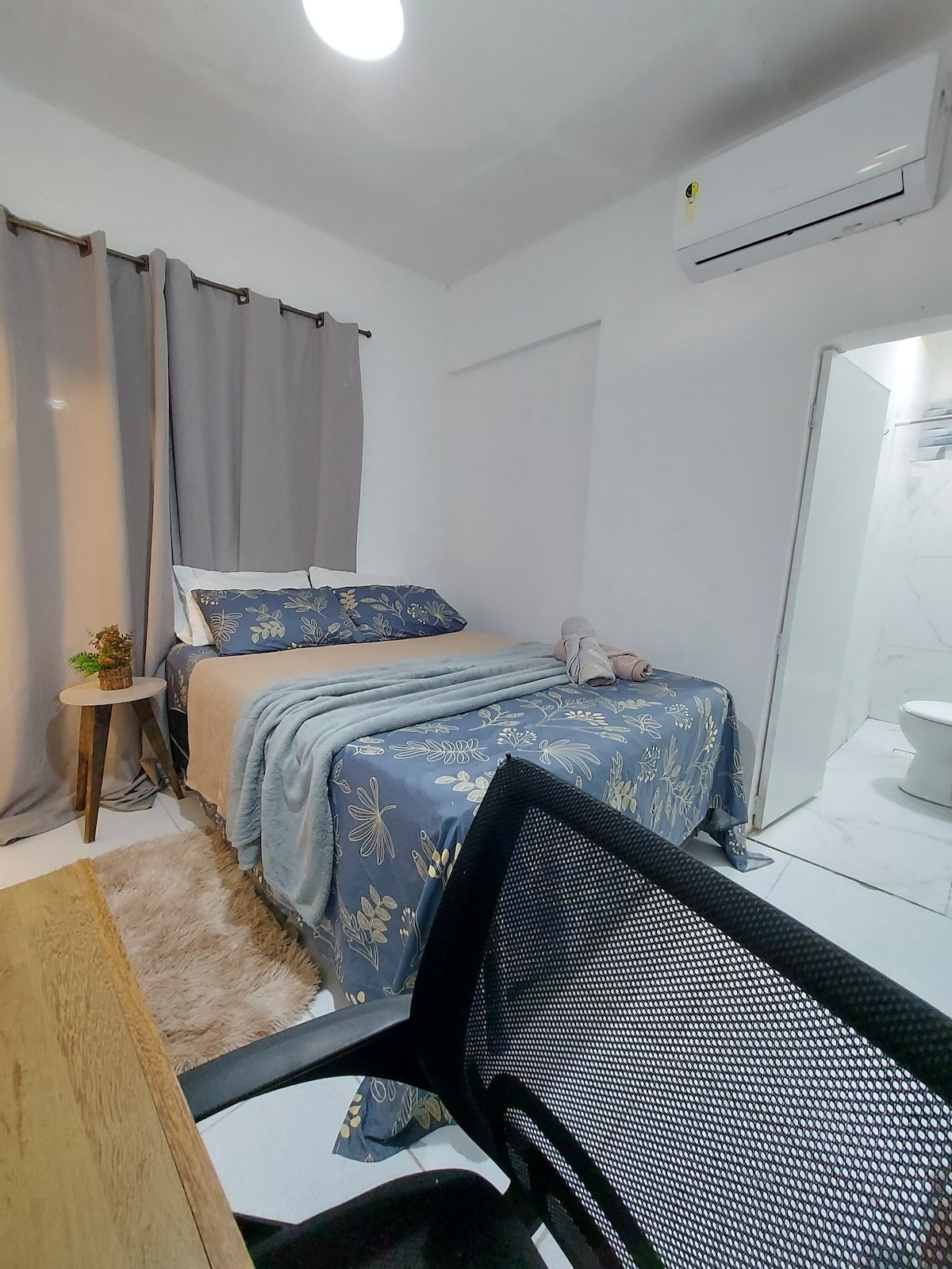 Você vai se sentir em casa, nesse aconchegante flat tipo estúdio, mobiliado com TV Smart, Ar-condicionado Split, geladeira, cooktop, microondas, sanduicheira, cafeteira,liquidificador, secador de cabelos, ferro de passar. Conta com uma cama de casal, mesa, cadeiras e utensílios para cama, mesa e banho. Você fará self check in se identificando na portaria e tendo acesso ao ap através de senha fornecida pela anfitriã. Dispomos de porteiros 24h que facilita o check in e check out.