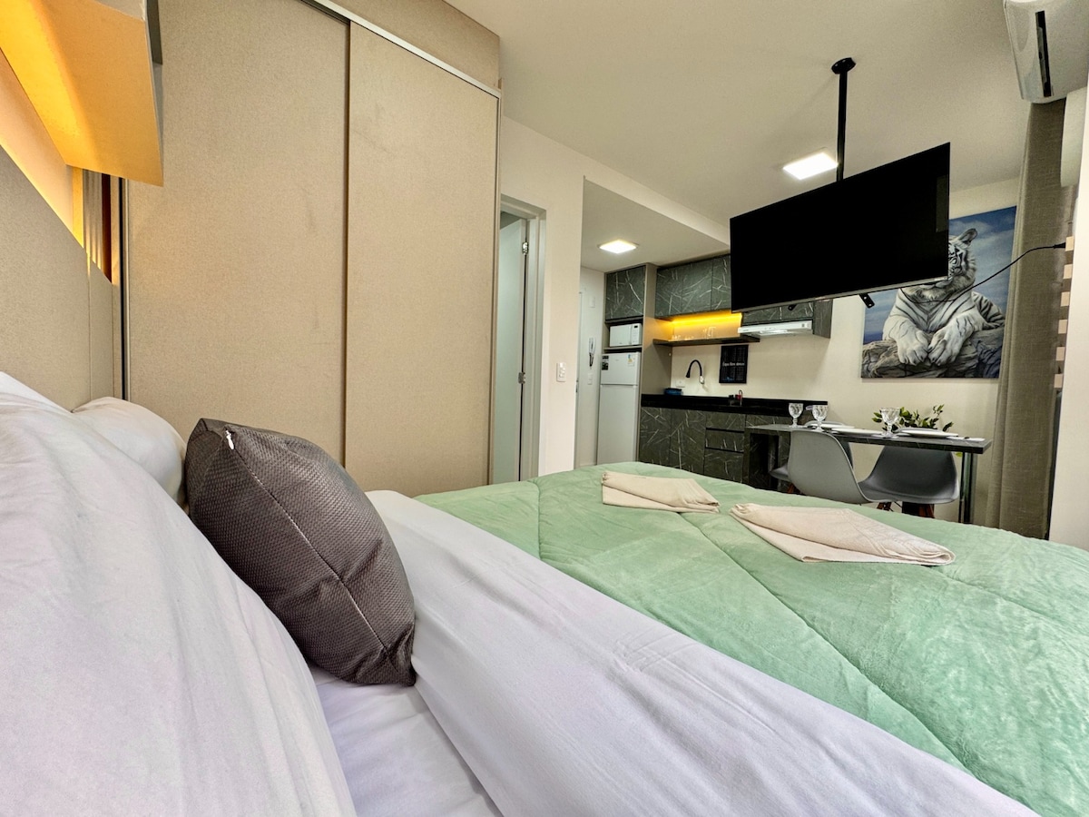 Flat 100% reformado, totalmente repaginado com todo conforto para sua estadia. Localizado dentro de um hotel 4 estrelas, sua estadia contará com serviço de quarto* todos os dias (exceto aos domingos - *sem troca de enxoval). Recepção 24 hrs com garagem incluída. O hóspede tem acesso a piscina, sauna e academia. O café da manhã do hotel não está incluso na estadia, porém os hóspedes porem desfrutá-lo pagando uma taxa diretamente no local.