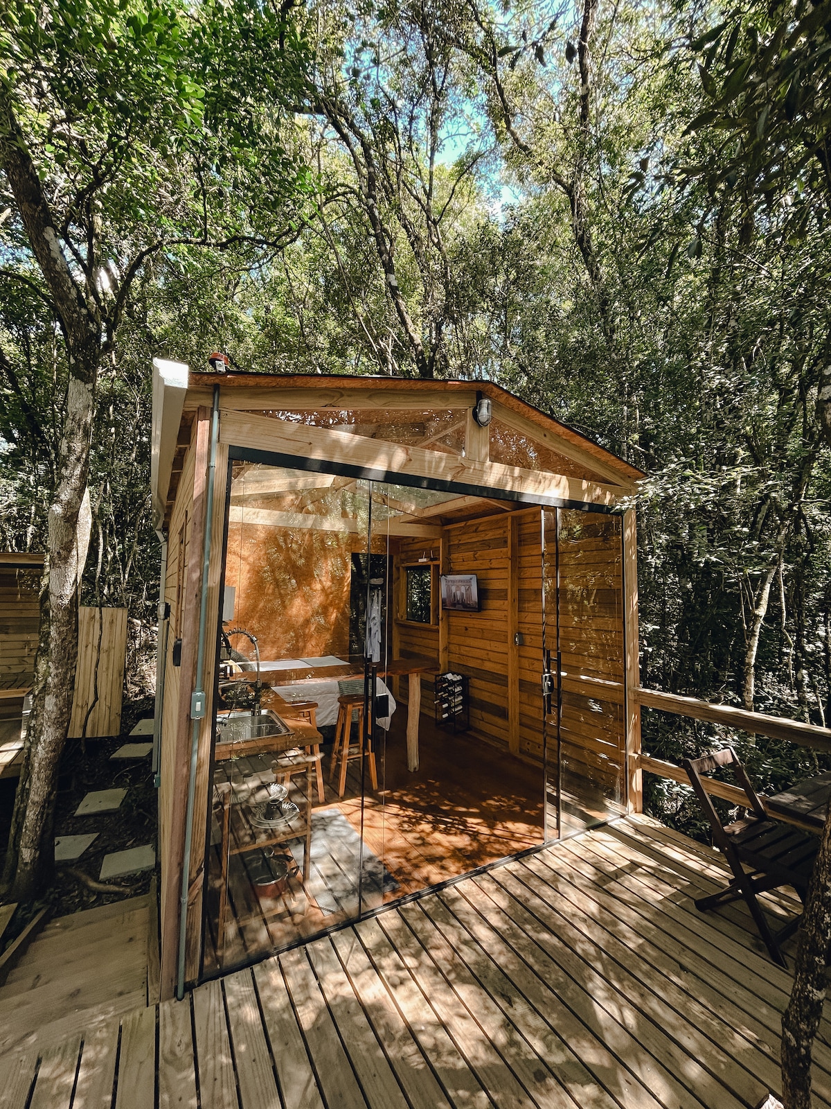 Essa acomodação é projetada e decorada com muito carinho e cuidado, e cada detalhe foi pensado para deixar sua estadia mais gostosa. É um espaço perfeito para quem está procurando um cantinho para curtir em meio a natureza ou até um espaço para seu home office. Possui janelas amplas, com deck em frente, que dão vista incrível para o nascer do Sol.