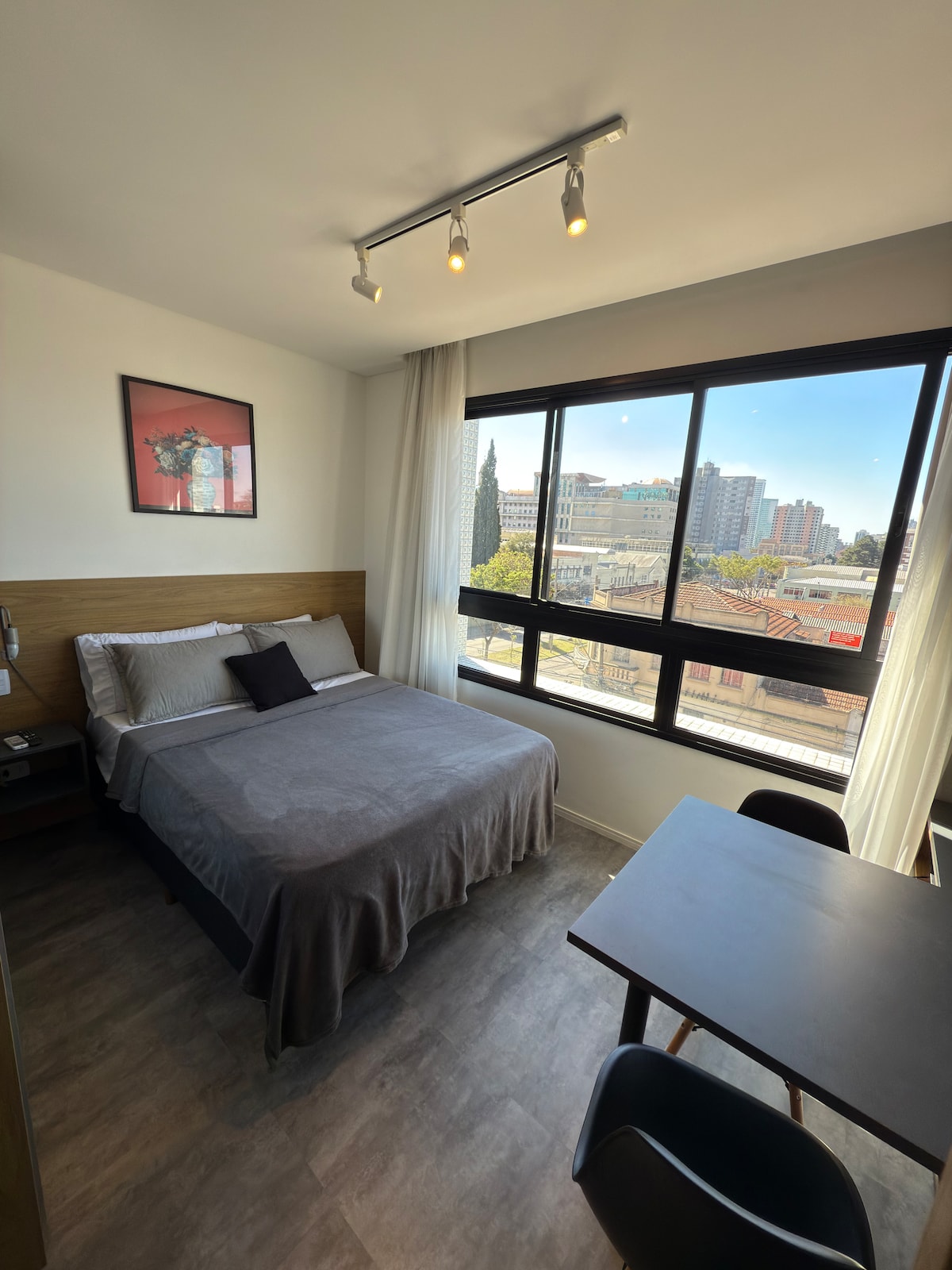 Modern studio condo in Rebouças, 5 min from Mercado Municipal, Shopping Estação, and near cafés and bars. Easy access: 10 min to the bus station, 25 min to the airport. AC + heating; 400 Mb Wi‑Fi + desk; queen bed with hotel‑style linens + blackout shades; equipped kitchen; smart TV streaming; 24 h self check‑in; laundry & gym in the building.