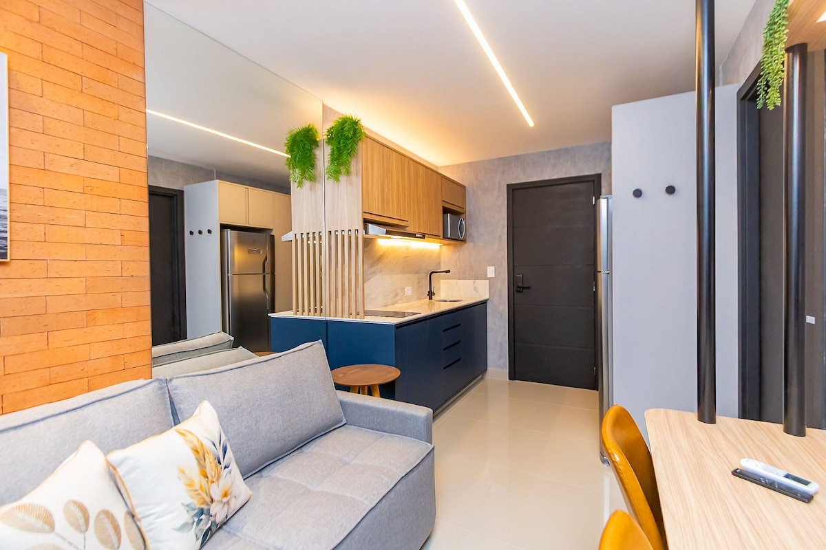 Studio recém reformado e decorado no Centro Cívico com: ar condicionado em todo o ambiente, cozinha completa, smart tv e churrasqueira privativa O prédio oferece piscina aquecida, academia, terraço panorâmico, sauna, brinquedoteca, jacuzzi e lavanderia (paga) Ideal para até 2 pessoas, fornecemos roupas de cama de tolhas de 1ª linha Localização excelente, perto de shoppings, mercados, restaurantes e padarias com fácil acesso para explorar a cidade Estacionamento pago no local disponível