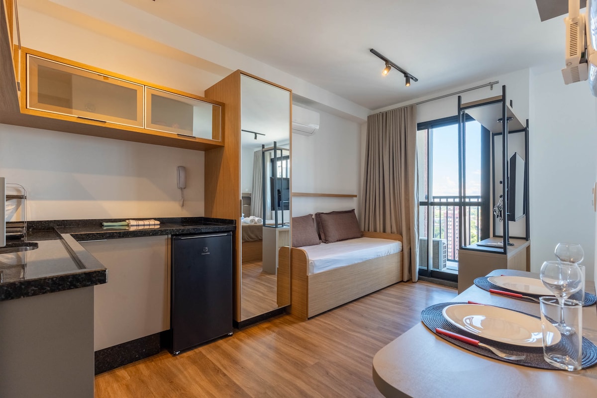 O estúdio está em um condomínio clube de alto padrão, com garagem inclusa. Nas áreas comuns possui: piscina coberta e aquecida (uma delícia!), academia, lavanderia, quadra, parquinho, horta, mercado autônomo, espaço para trabalho e sauna. É uma gracinha, bem completo, acomoda 4 pessoas (1 cama casal e 1 sofá cama), tem ar condicionado, uma ducha gostosa pro banho e uma cozinha completa. É pra se sentir em casa mesmo!