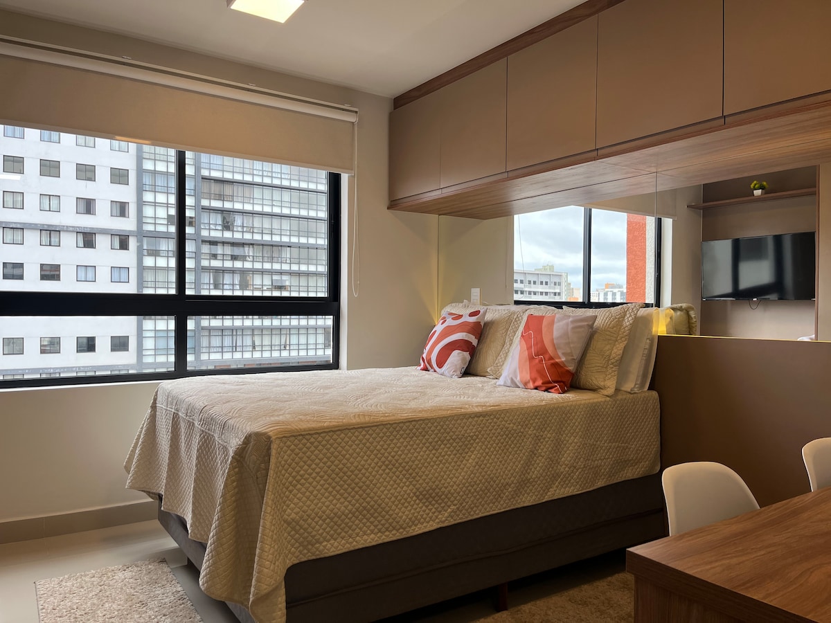 Apartamento com garagem e ar-condicionado, com vista incrível do 21º andar, Studio em condomínio clube de alto padrão. Áreas comuns com piscina aquecida, academia, coworking, sauna, lavanderia, playground e mercado autônomo. Acomoda 4 pessoas (1 cama casal e 1 sofá-cama), equipado com enxoval completo, ducha relaxante, cozinha planejada com diversos eletrodomésticos e utensílios, e TV Smart moderna que garante o entretenimento.