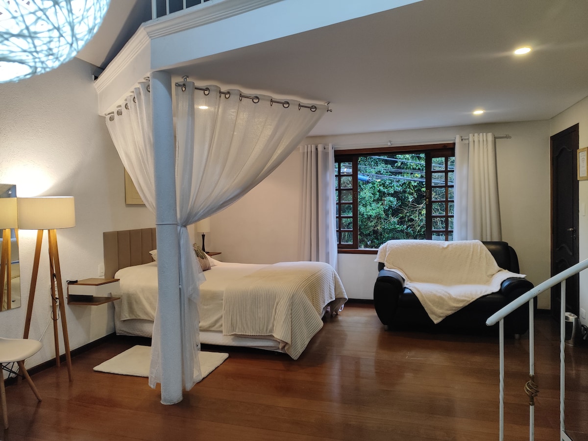 Esta acomodação elegante é perfeita para casais que procuram conforto e aconchego para descansar entre os muitos passeios possíveis em nossa região. Conforto garantido também para os que viajam à trabalho e merecem um bom banho e sono restaurador.