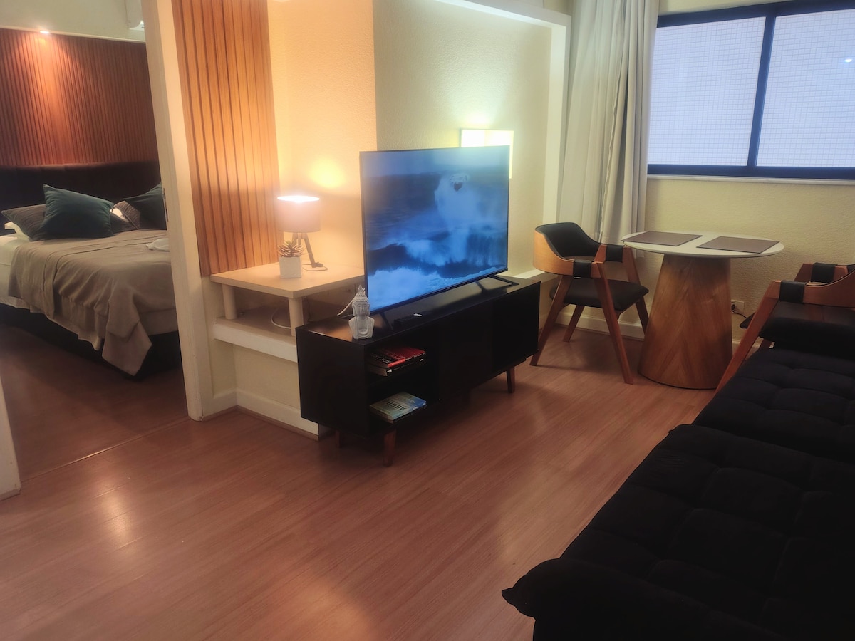 FLAT TIPO LOFT Espaço completo com 43 m2, o dobro dos hoteis, com garagem grátis. Flat 5 estrelas dentro de um hotel 4 estrelas, com uso grátis de piscina, sauna, academia, salão de jogos, recepção 24 horas, sala de espera e serviços pagos como café da manha , restaurante e room service, tudo com segurança. À 400 m do centro, perto de supermercados, farmácias, teatro, restaurantes. Consulte nos aplicativos as disponibilidades dos flats 702, 901,902, 1002 e 1003. Temático Londres. Tudo novo.