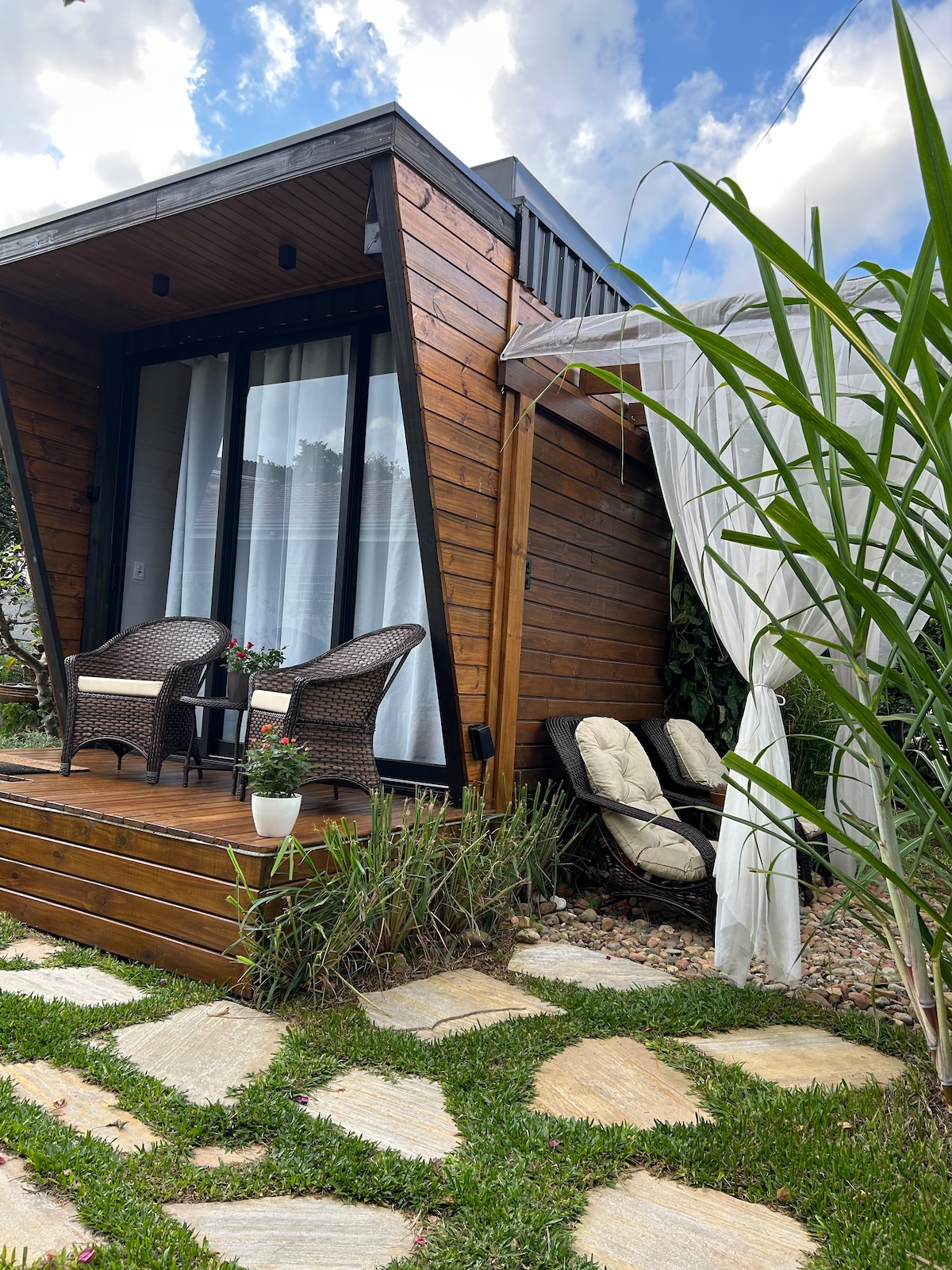 Essa acomodação é projetada e decorada com muito carinho e cuidado, e cada detalhe foi pensado para deixar sua estadia mais gostosa. É um espaço perfeito para quem está procurando um cantinho para curtir em meio a natureza ou até um espaço para seu home office. Possui janelas amplas, com deck em frente, que dão vista incrível para o nascer do Sol.