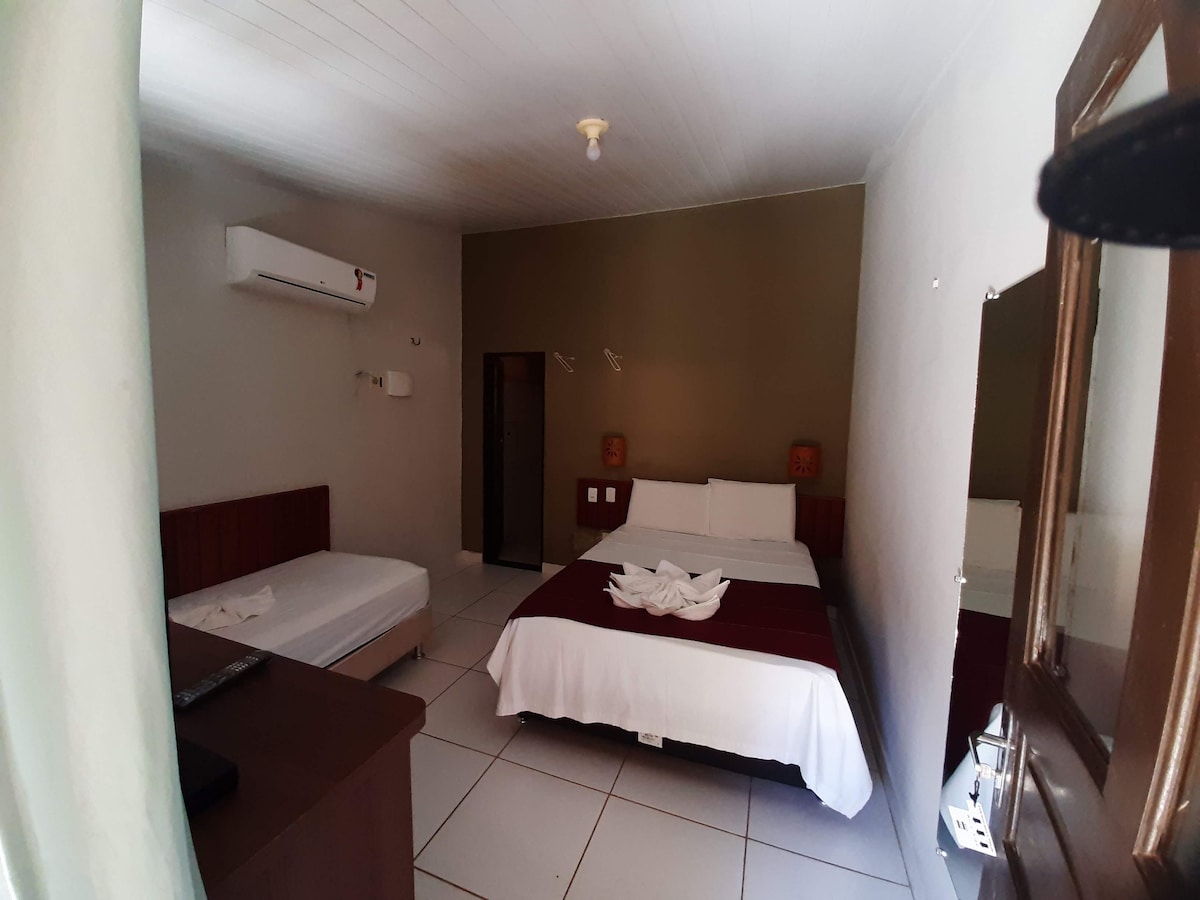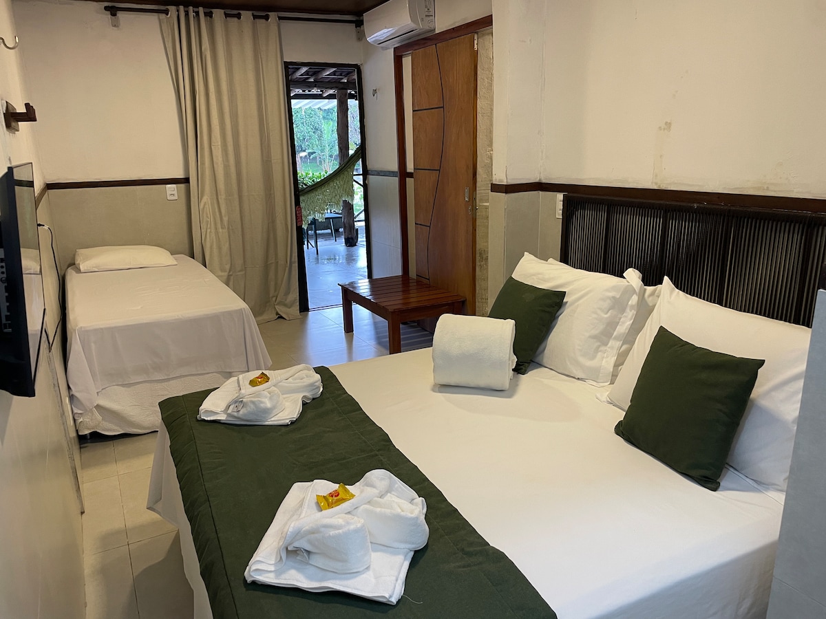 As suítes possuem 1 cama casal e 1 cama solteiro, podendo adicionar mais uma cama de solteiro. Suites completas com entrada individual, ar condicionado e frigobar.