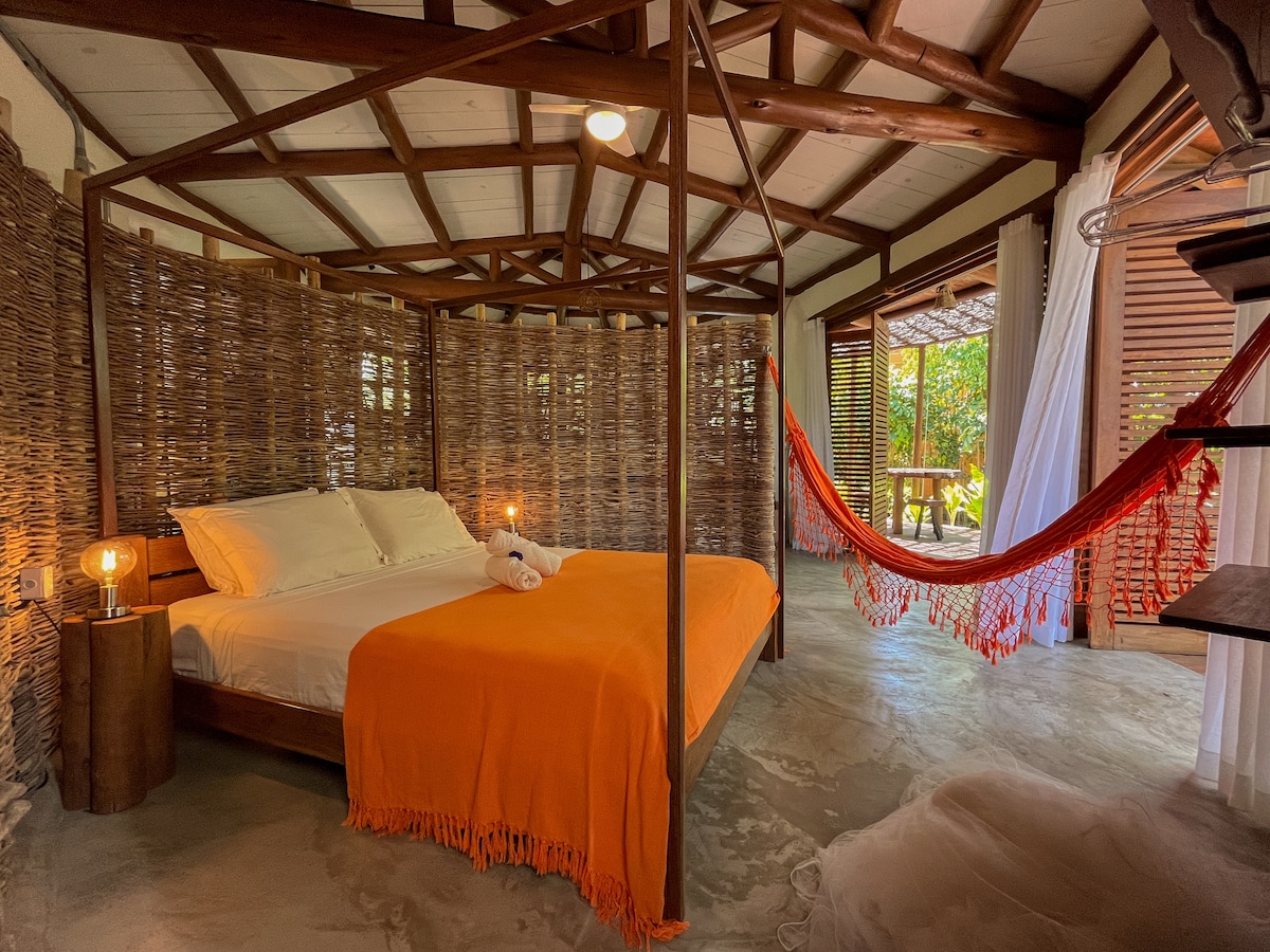 A suíte dupla/tripla possui banheiro privativo com Teto Solar e varandinha com rede com vista para o ventilado jardim, ela é ideal para até 3 pessoas. Este quarto é equipado com ar-condicionado, ducha quente, cortina blackout, roupa de cama/banho, frigobar, armário, escrivaninha com cadeira giroflex para HomeOffice, . Também dispomos de uma cozinha completa, com varanda, redes e sofá numa casa de apoio a 15 metros dos quartos; WIFI e estacionamento interno.