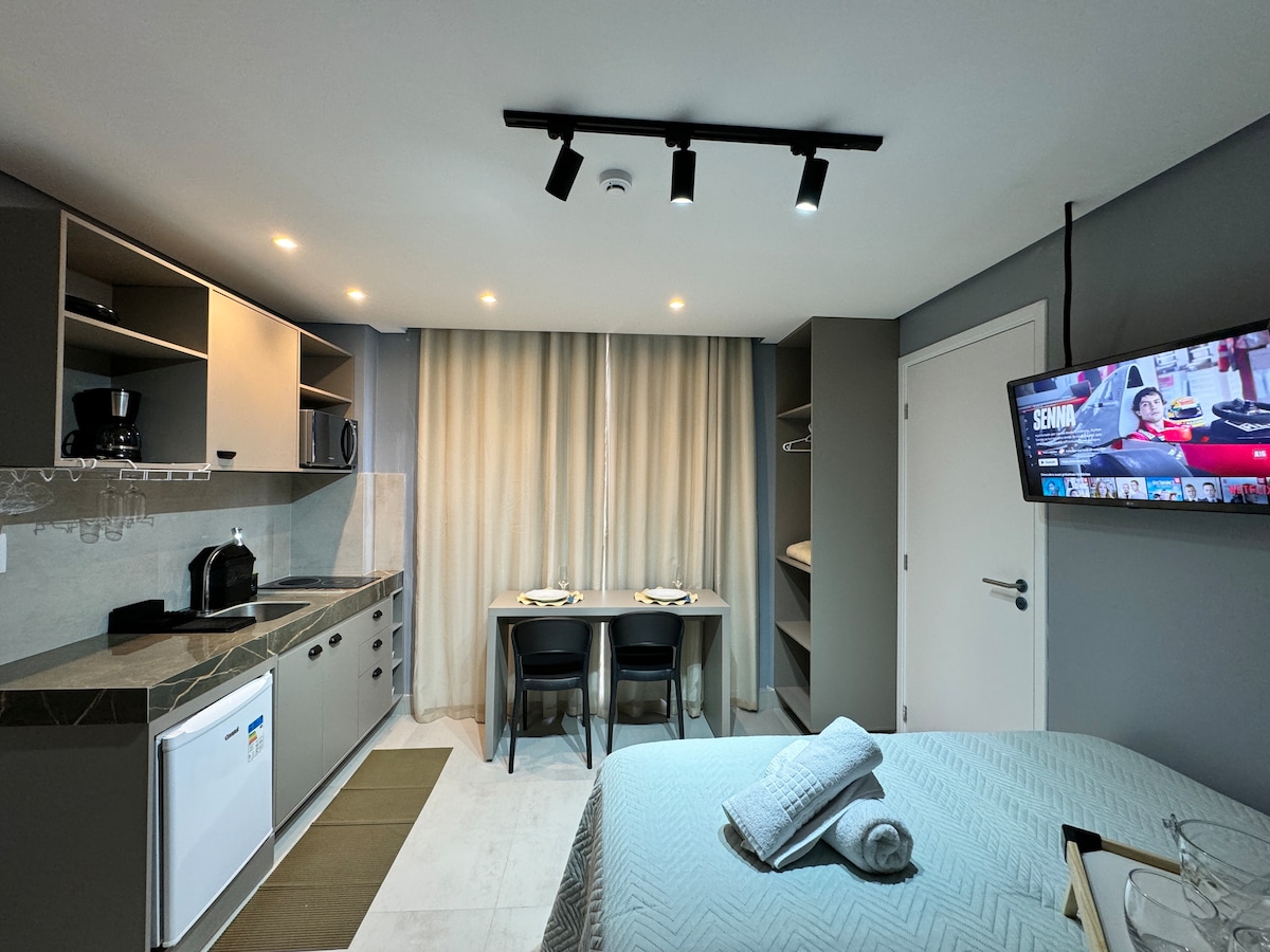Viva o luxo neste refúgio moderno (lançado em abril/25)! Relaxe na hidromassagem com cromoterapia e controle a iluminação com a Alexa Echo Studio de 330W RMS. O espaço conta com ar-condicionado de 18.000 BTUs que gela muito, frigobar, máquina lava e seca e enxoval premium. Destaque para o ambiente de maquiagem com cadeira profissional, secador e espelho GG com LED. Com decoração boho sofisticada, este espaço foi pensado para proporcionar conforto e elegância. Reserve já!