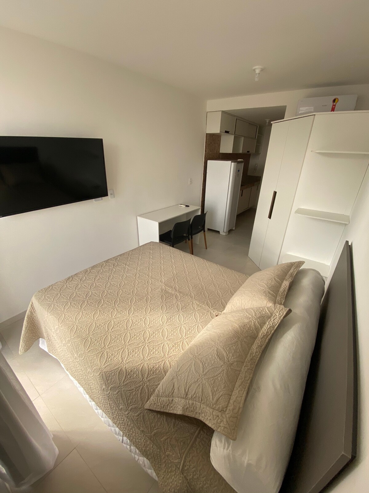 Você vai se sentir em casa, nesse aconchegante flat tipo estúdio, mobiliado com TV Smart, Ar-condicionado Split, geladeira, cooktop, microondas, sanduicheira, cafeteira,liquidificador, secador de cabelos, ferro de passar. Conta com uma cama de casal, mesa, cadeiras e utensílios para cama, mesa e banho. Você fará self check in se identificando na portaria e tendo acesso ao ap através de senha fornecida pela anfitriã. Dispomos de porteiros 24h que facilita o check in e check out.
