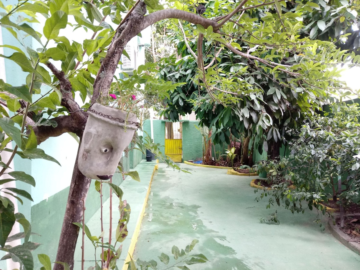Nossa suíte conta com ar condicionado, uma cama de casal, banheiro privativo e uma pequena área de estar. A decoração é moderna e acolhedora, com toques de natureza que fazem você se sentir em casa. Desfrute de um café da manhã no jardim decorado, rodeado por árvores e flores que criam um ambiente sereno.