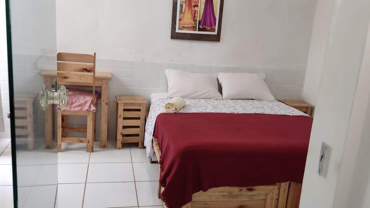 Espaço bem equipado com suíte. Possui ar condicionado, tv smart,frigobar,cama de casal e guarda roupas. Cozinha externa compartilhada, equipada com fogão, geladeira, mesa, cafeteira, sanduicheira, micro-ondas, dentre outros. Tem churrasqueira com área aberta para lazer. A cozinha é bem equipada com o necessário para preparar suas refeições. O ambiente é tranquilo, familiar e muito bem localizado. Próximo ao aeroporto dos Guararapes, centro da cidade, cidade universitária, Boa Viagem, Olinda...
