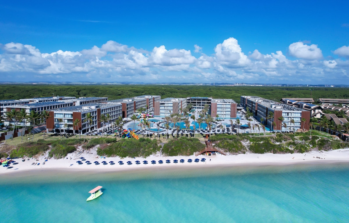 Nossa primeira acomodação pé na areia, em uma das praias mais bonitas do Brasil. Um mix de requinte e conforto, nosso espaço foi pensado para atender os mais atentos olhos. Inserida em complexo de lazer, nossa acomodação conta com um jardim de piscinas e áreas compartilhadas de livre acesso como brinquedoteca, sauna, cinema, SL de jogos, parque aquático infantil e restaurante, além e algumas espaços terceirizados (SPA, SL de Beleza e Conveniência). Café da manhã NÃO incluso no valor da diária.