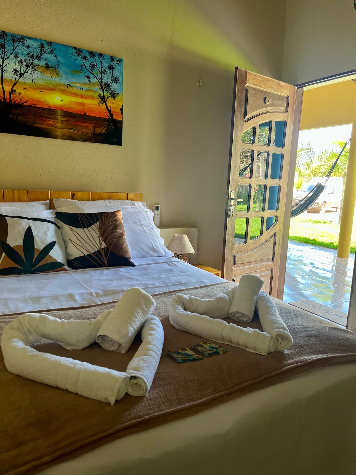 A suíte está equipada com um banheiro privado, frigobar, ar condicionado e uma rede, oferecendo conforto e conveniência.