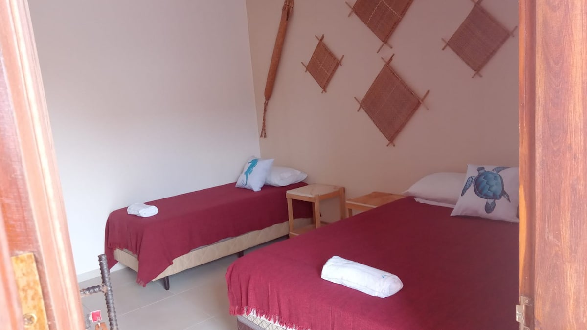 Apartamento na charmosa e aconchegante Pousada Preá. Com decoração regional, ar condicionado, frigobar, banheiro com chuveiro privativo, wi-fi, rede e vista para o jardim.