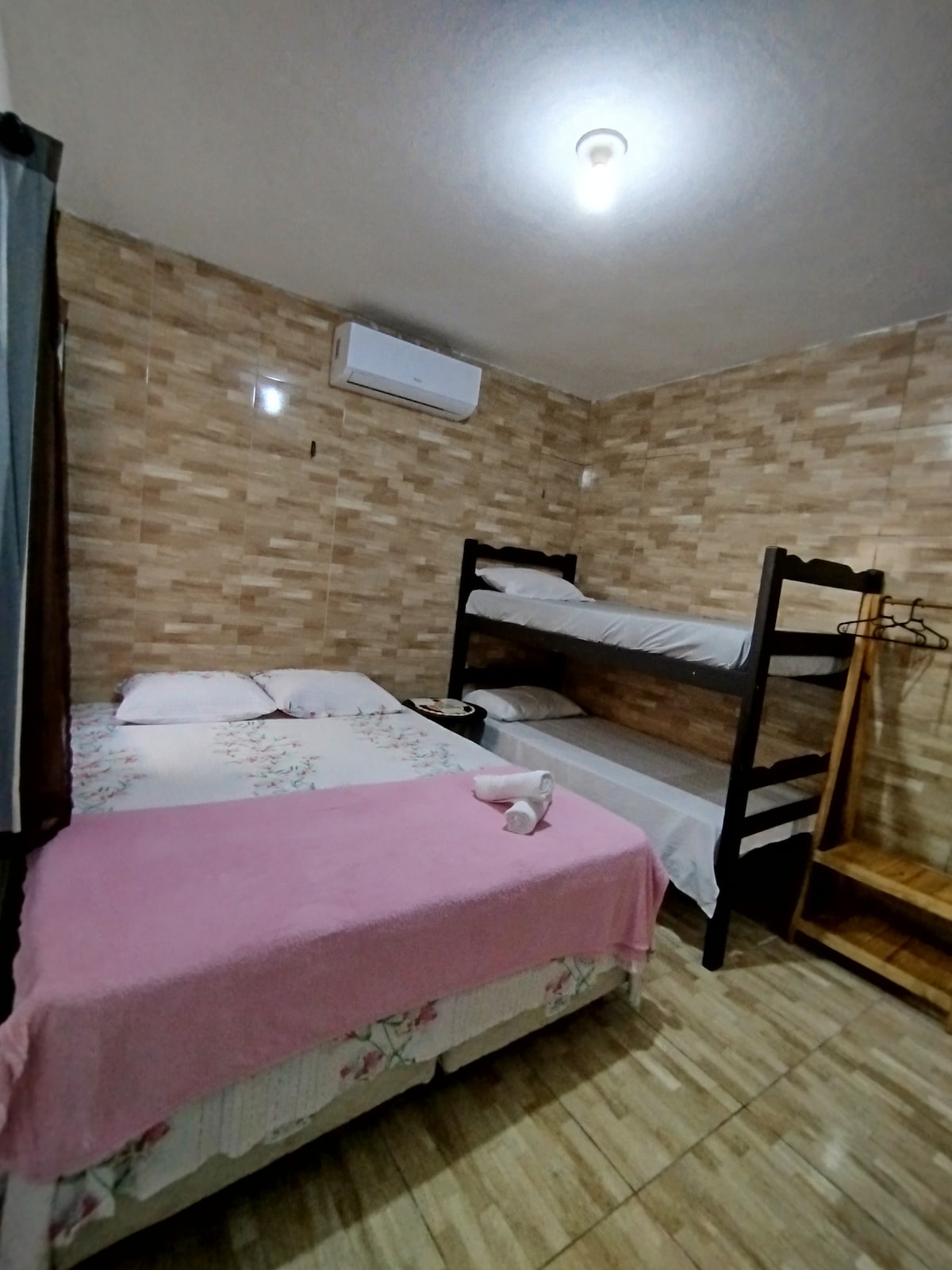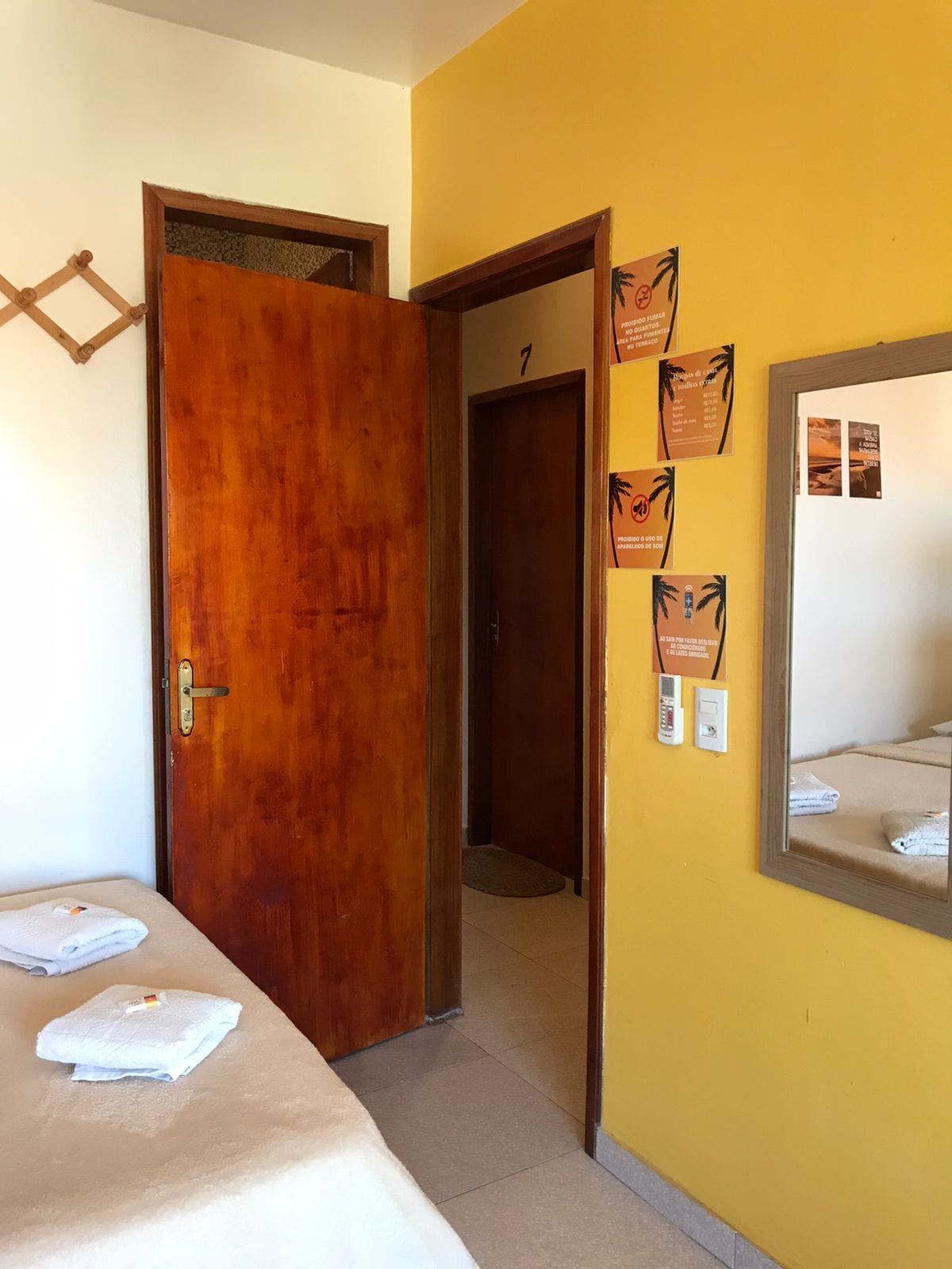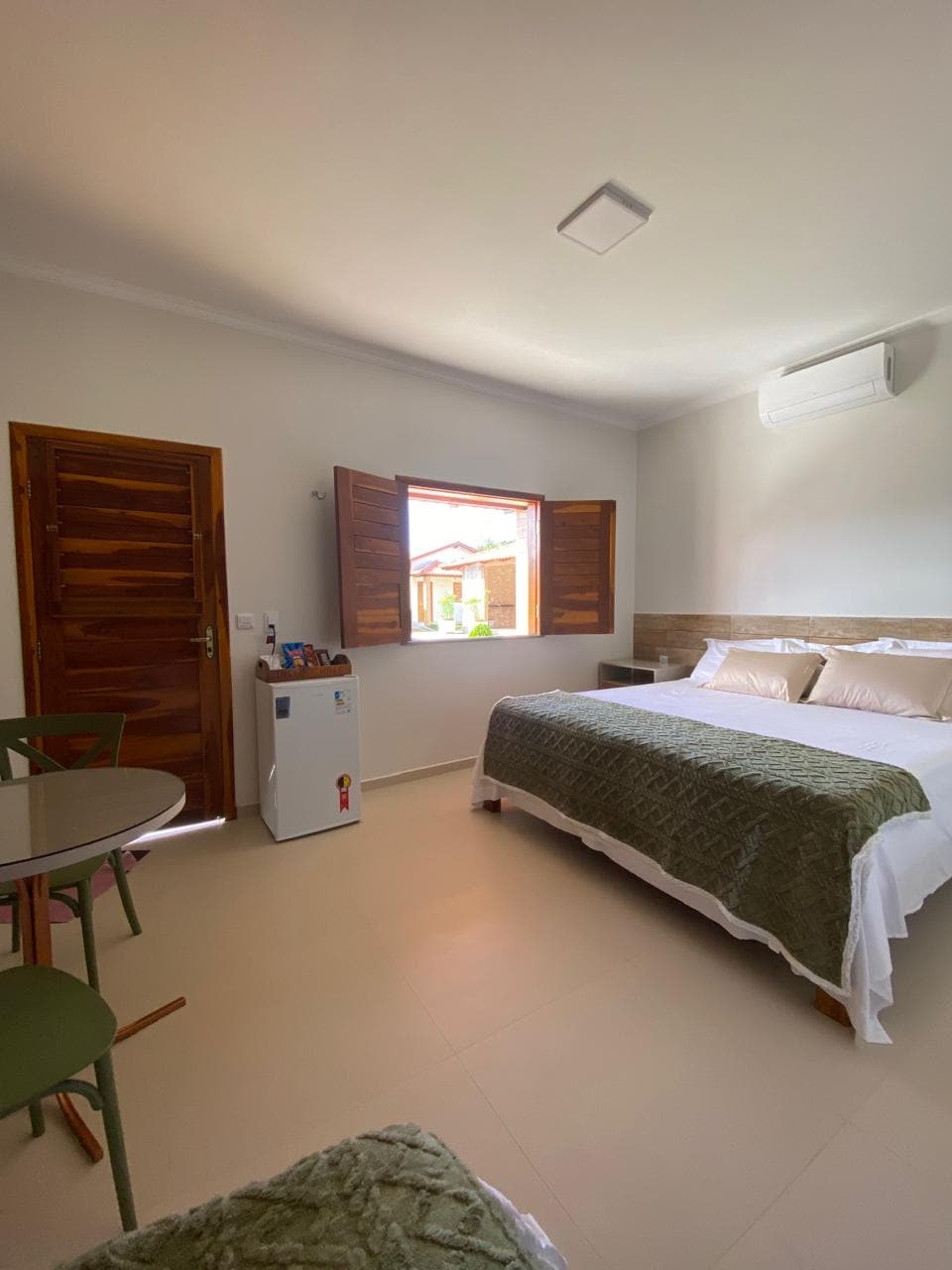 O quarto conta com ar condicionado, cama casal, frigobar e banheiro privativo com chuveiro elétrico.