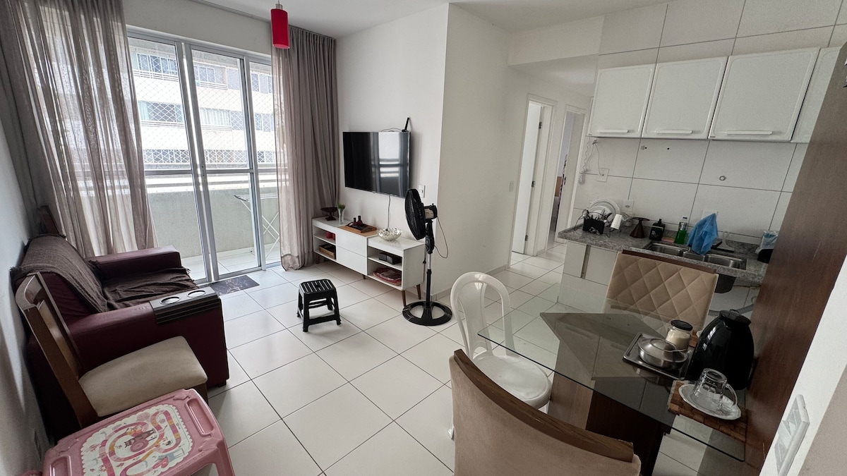 Apartamento completo e bem localizado na Av. da Integração, a menos de 1 km de bares, restaurantes, Smart Fit, Extrafarma e diversas conveniências. Em frente ao prédio há um supermercado com padaria e, no térreo, uma loja de cookies e café. O apartamento possui 2 quartos com ar-condicionado: um com 1 cama de casal e outro com 2 camas de casal. Conta ainda com 1 banheiro social, sala ampla e cozinha americana totalmente equipada com utensílios.