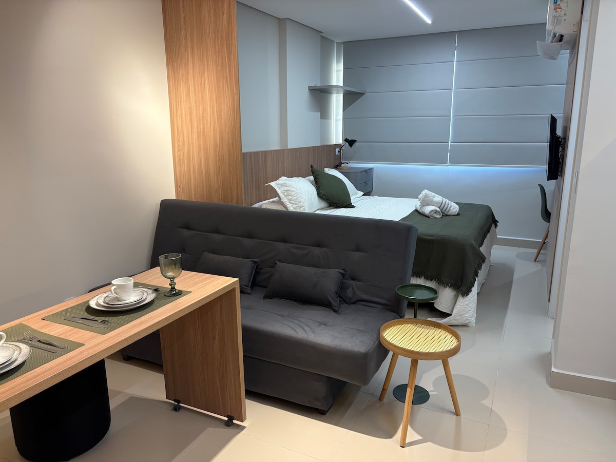 Acomoda-se com conforto até 2 pessoas em 1 quarto com cama quern. Há ainda um sofá-cama individual para o caso de um terceiro hóspede, para hospedagens curtas. Cozinha americana completa (eletrodomésticos, louças e panelas) integrada à sala. Outros utensílios como secador de cabelo, tábua e ferro de passar estão disponíveis.