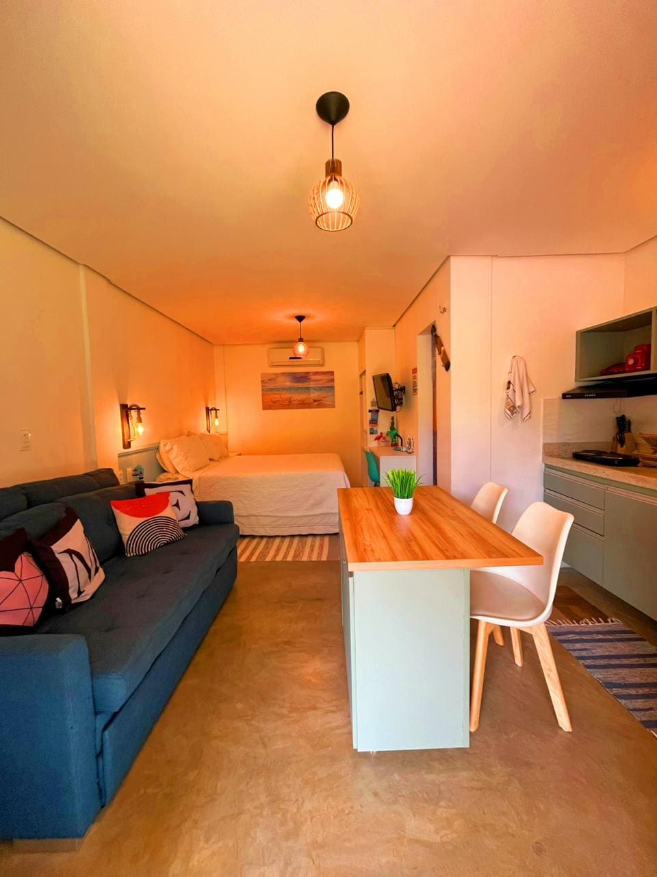 Acomoda-se com conforto até 2 pessoas em FLAT STUDIO - 1 quarto com cama Queen. Há ainda um sofá-cama individual ao lado da cama Queen para o caso de um terceiro hóspede, para hospedagens curtas. Cozinha americana completa (eletrodomésticos, louças e panelas) integrada à sala. Outros utensílios como secador de cabelo, tábua e ferro de passar estão disponíveis.