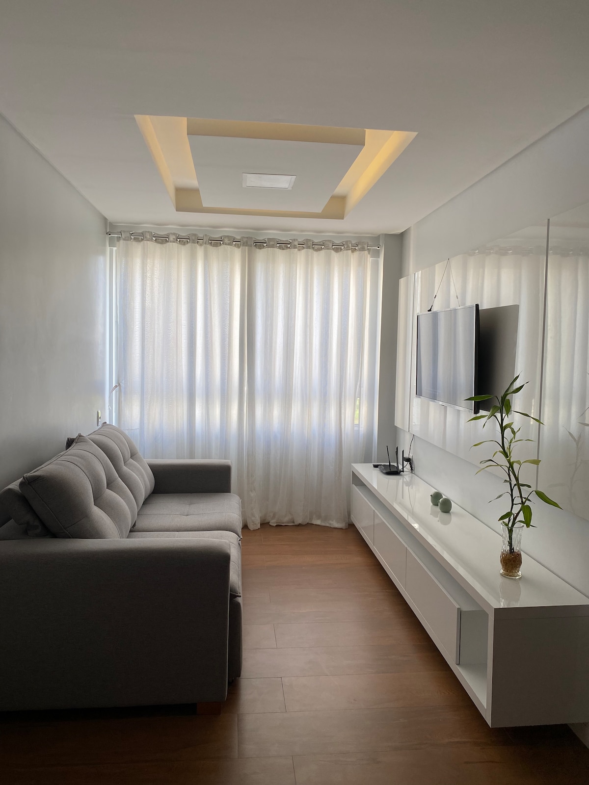 Esse apartamento é perfeito pra acomodar toda a família. Possui uma suíte com cama de casal, um quarto com cama de casal e um quarto com uma cama de solteiro e uma cama auxiliar, todos com ar condicionado. Uma cozinha completa com todos os utensílios e máquina de lavar. Possui uma pequena varanda e banheiro social. O hóspede terá acesso a duas vagas de garagem. O condomínio é arborizado, com playground, brinquedoteca, piscina, salão de festas e churrasqueira. Sinta-se em casa conosco