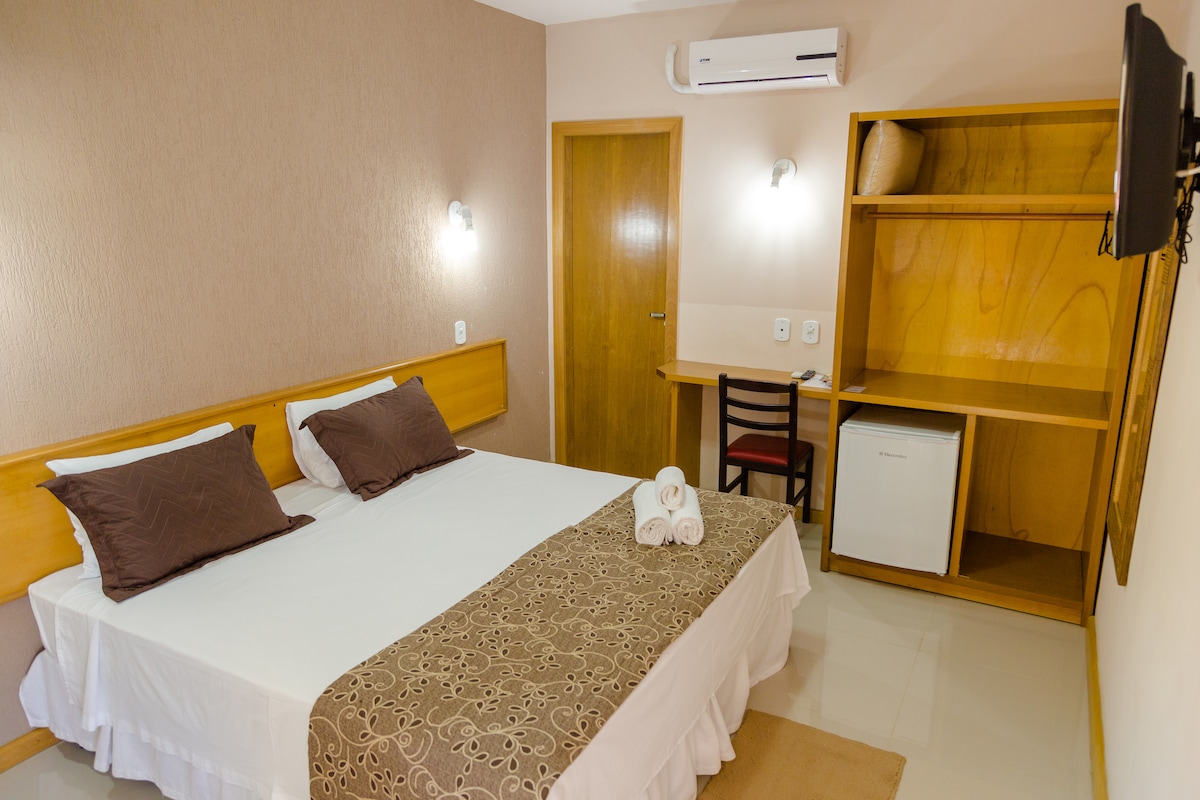 - Chalé Beija-flor Master de 70 metros quadrados, super confortável com dois ambientes, Cama King Size, Ofurô, lareira, frigobar, banheiro com box, TV de 43 polegadas 4k (TV por assinatura com canais em HD), WI-FI, sala de estar, ar condicionado quente e frio, lavabo separado - Mini cozinha, mesa para refeição, cafeteira, micro-ondas e utensílios de cozinha completos e uma linda varanda com vista para o rio. Obs:. Criança até 05 anos tarifa zero. Criança de 06 à 12 anos 20% da diária.