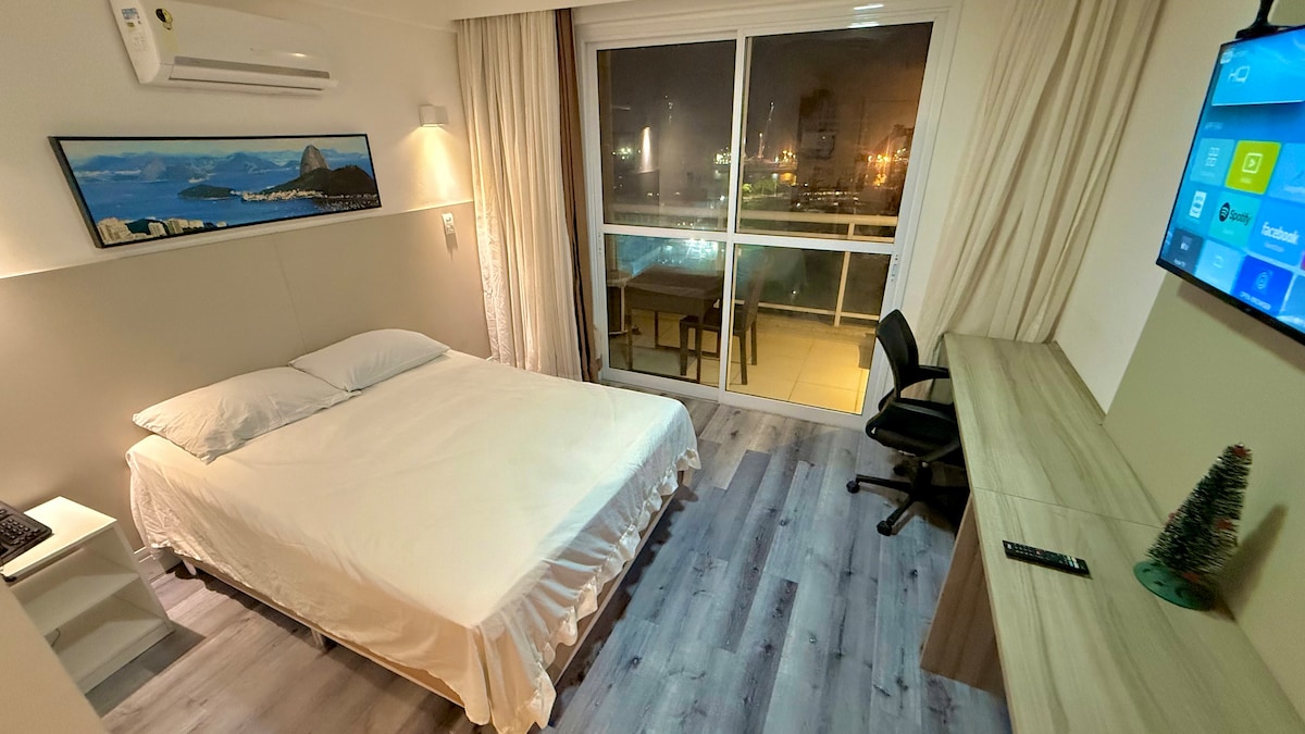 Ampla e confortável suíte com varanda, cozinha completa, uma cama e um sofá cama para casal, ótima localização no bairro da Barra da Tijuca, serviços de hotel, limpeza, arrumação, restaurante com serviço de quarto, segurança, estacionamento diária R$ 15,00, acesso à Praia da Reserva de balsa pela lagoa , clube em frente com academia e piscinas, tudo incluso na hospedagem, fácil acesso aos shoppings Vogue Square, Rio Design e Millennium, com diversas lojas e restaurantes.