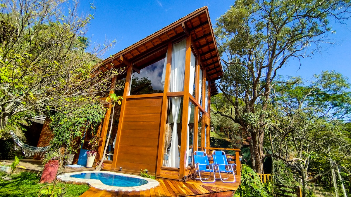Uma cabana super romântica em Araras, um dos refúgios mais charmosos da serra do Rio de Janeiro. Com banheira, piscina, lareira, fogo de chão, churrasqueira, rede suspensa... Um pedacinho do paraíso para você desacelerar, relaxar e renovar suas energias. Cercada por uma natureza exuberante, uma vista apaixonante e repleta de muita paz. A cabana oferece muito charme, sofisticação, conforto e uma arquitetura impactante. Cada detalhe foi pensado para que possam viver uma experiência única!