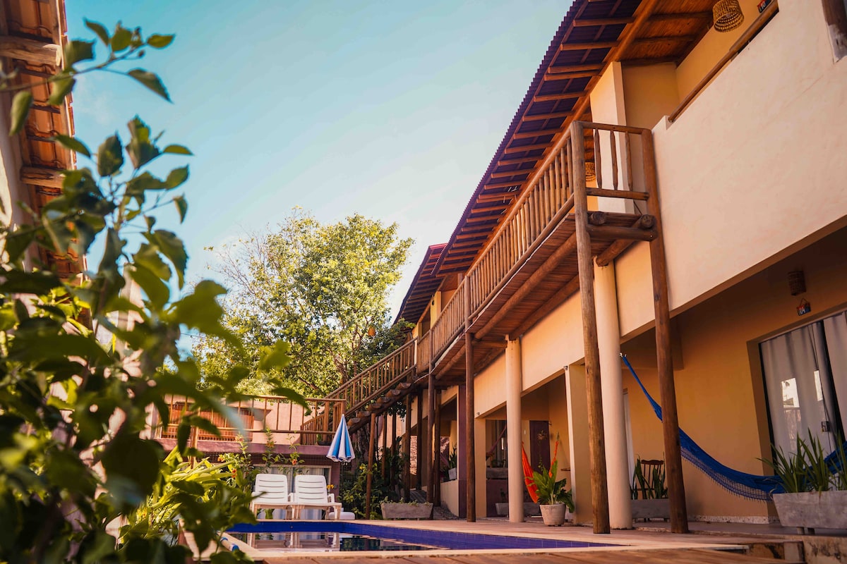 Apartamento tipo loft, primeiro andar, vista privilegiada para piscina central (a melhor dentro do condomínio), lado da sombra, aconchegante, novo, com utensílio completo de cozinha (geladeira, fogão, microondas, torradeira, liquidificador, cafeteira, pratos, copos, taças, talheres, tigelas, potes para mantimentos), lençóis, toalhas, produtos de higiene, acomoda até 4 pessoas, localizado em condomínio fechado (Solar Água), fica a 400 metros da Rua Principal de Pipa (Apartamento 261)
